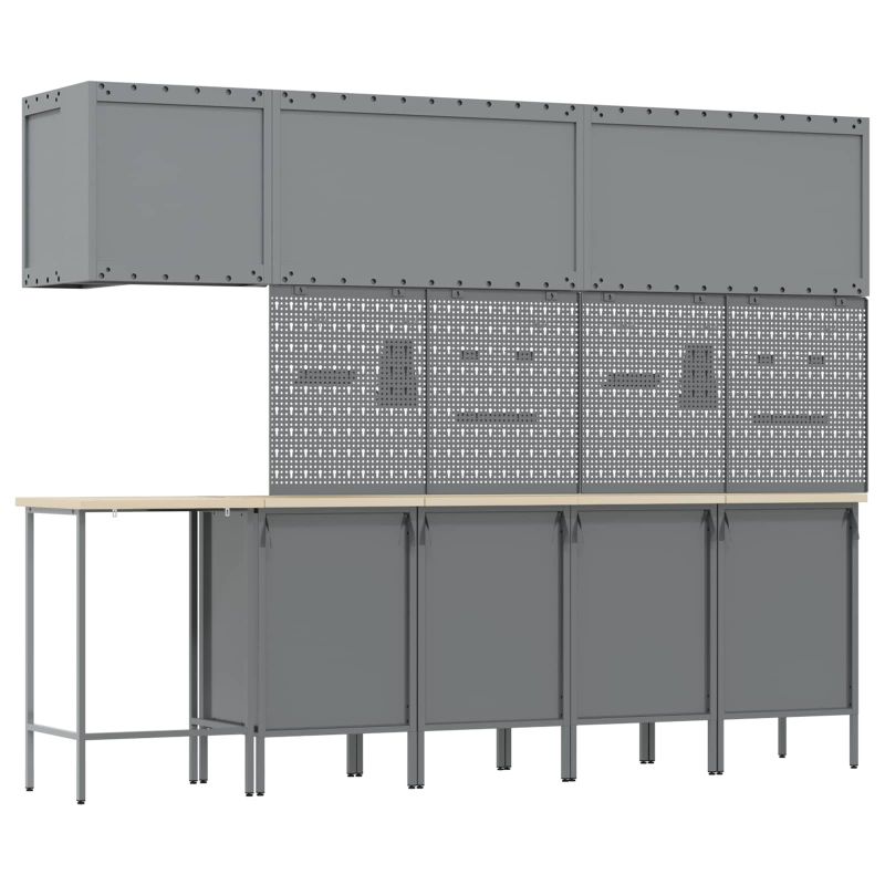 Комплектът работни шкафове е здраво и стилно решение за организиране на инструментите в работилницата ви. Със своя модерен и минималистичен дизайн, той съчетава практичност с визуална привлекателност, правейки всяка работилница да изглежда подредена и професионална. Материали: Този комплект е направен от прахово боядисана стомана и инженерна дървесина, осигурявайки здраво решение за съхранение. Материалите са избрани за своята издръжливост, а праховата боя гарантира защита от износване. Включени компоненти: Включва различни отделения за съхранение и камърни брави, което позволява лесен достъп и безопасност на инструментите. Тази система прави комплекта наистина ценен за всяко работно място. Регулируемите крака на шкафа увеличават стабилността на неравни повърхности. Характеристики/Функция/Дизайн: Модерният му дизайн е прост и функционален, лесно се вписва в различни работилнични стилистики. Чистите линии предлагат изискан вид и практично пространство за инструменти. Регулируемите крака позволяват настройки според вашите нужди. Препоръчителни употреби: Проектиран основно за вътрешна употреба, той е чудесен за работилници, където е важна организацията. Подходящ е за професионални работни места и домашни гаражи, където подредените инструменти подобряват достъпа и продуктивността. Грижа и поддръжка: За сглобяване са нужни двама души и отвертка за точност. Редовната поддръжка включва проверка на бравите и регулиране на краката, когато е необходимо, за да се запази стабилността и функционалността.