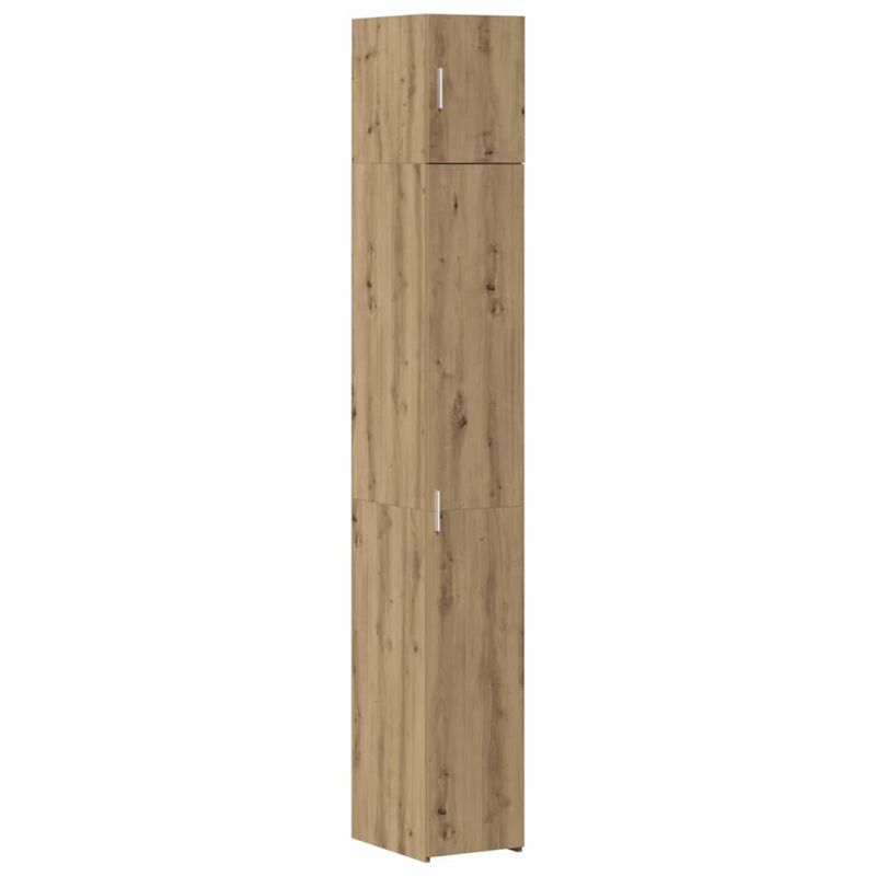 Този стилен шкаф от инженерна дървесина съчетава модерен дизайн с отлична функционалност - идеален за организиране на дома, без да жертва естетиката. С елегантни линии и минимално декориране, шкафът предлага много място за съхранение с компактни размери от 30 x 42.5 x 225 см. Изработен е от инженерна дървесина, което го прави здрав и подходящ за всякакви среди. Материал от инженерна дървесина: Този шкаф е направен от инженерна дървесина, което осигурява здравина и гладка повърхност с модерен вид. Структурата му е стабилна, независимо от условията. Обширен капацитет за съхранение: С комбинирането на един стенен и два високи шкафа, шкафът максимизира пространството, изглеждайки елегантно. Без значение къде го ползвате, той предлага лесен достъп до всичко. Стилен модерен дизайн: С чисти линии и минималистичен вид, шкафът лесно се вписва в съвременни интериори. Неговата елегантност е перфектна за домове, ценящи простотата и функционалността. Всестранна вътрешна употреба: Направен за закрито, този шкаф е идеален за много места - от съхранение на книги в кабинета до порцелан в трапезарията, лесно се адаптира към всякакви нужди. Сглобяване и поддръжка: Изключително лесен за сглобяване, шкафът си иска двама души и отвертка, а инструкциите са ясни. Поддръжката е без усилие, просто го избършете с суха кърпа, за да бъде като нов.