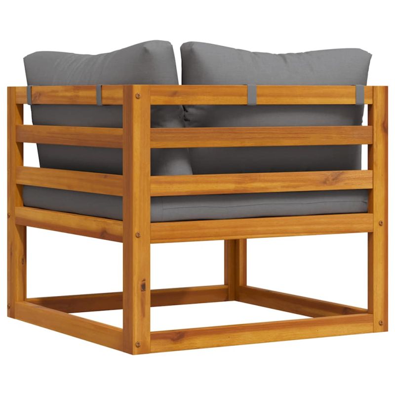 Този дървен модулен ъглов диван съчетава стил и функционалност и е предназначен за целогодишно ползване на открито. Изработен от акациево дърво масив, ъгловият диван е стабилен, здрав и издръжлив. Масленото му покритие го прави подходящ за използване на открито. Подплатените възглавници на седалката и облегалката осигуряват максимален комфорт при седене. Можете да го комбинирате с други налични модулни сегменти, за да създадете свои собствени конфигурации на градински лаундж комплект! Максимално 110 кг на седалка. Съобразете се с риска от открит огън и други източници на силна топлина в близост до продукта.