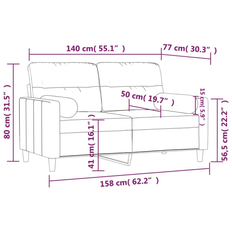 Този 2-местен диван, който се отличава с модерен дизайн и декоративни възглавници, ще бъде отлично място за разговори, гледане на телевизия или просто почивка. Издръжлив текстил: Материята се отличава със семпъл и изчистен вид, като същевременно остава дишаща и дълготрайна.Здрава и стабилна рамка: Металната рамка на тази мека мебел осигурява здравина и стабилност.Свалящи се калъфки за възглавници: Затварянето с цип позволява калъфките на тези възглавници лесни да бъдат свалени и изпрани, когато е необходимо.Удобна седалка: Диванът е много удобен с дебело подплатените седалки, подлакътниците и възглавниците за гърба. Освен това декоративните възглавници могат да добавят допълнителен комфорт, когато сте седнали или легнали.