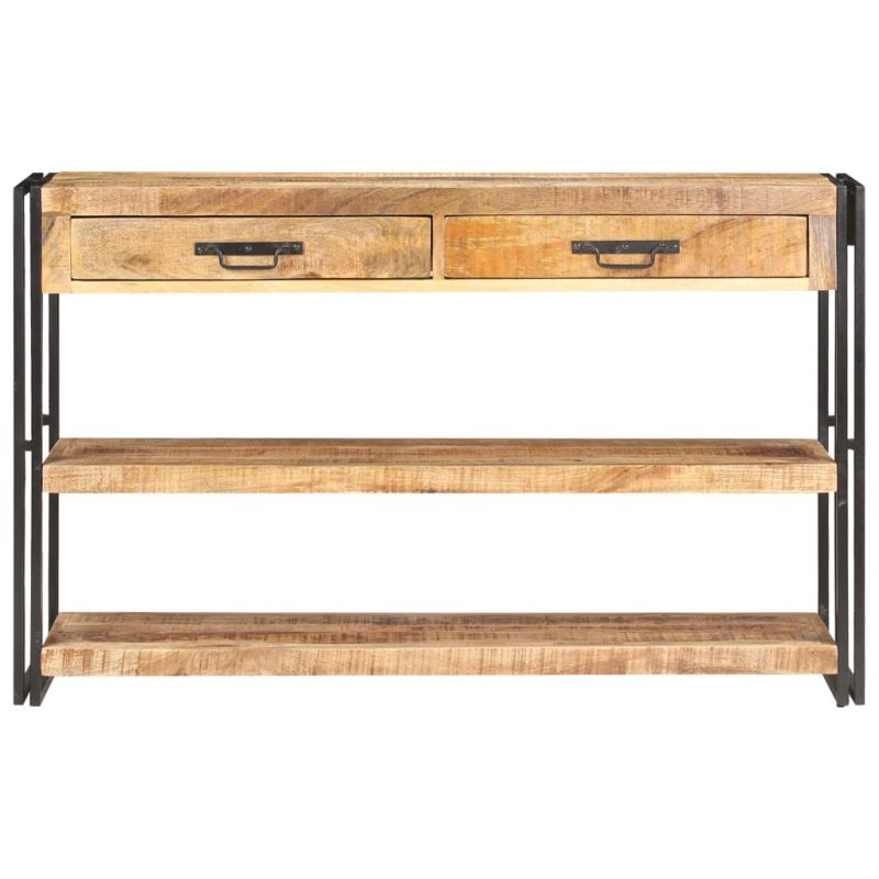 Създайте подреден дом с този елегантен дървен бюфет! Той е истински декоративно допълнение към вашия дом. Този бюфет за съхранение е изработен от мангово дърво масив – тропическа твърда дървесина. То има силата да понесе тежестта и да издържи на износването на времето. Освен това изящната изработка и красивите дървесни шарки правят всеки артикул малко по-различен от следващия. Стабилната прахово боядисана желязна рамка допринася за здравината. Стабилният плот е идеален за поставяне на декоративни предмети, като рамки за снимки или саксийни растения. Освен това конзолната маса разполага с 2 чекмеджета и 2 рафта, където да държите книги, списания и други предмети добре организирани и на достъпно място. Важна забележка: Цветовете на всеки артикул варират, което прави всяка мебел уникална. Доставката е на случаен принцип.