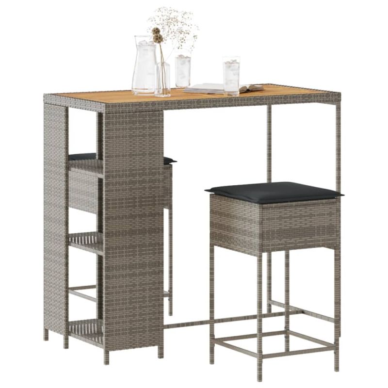 Този модерен градински бар комплект, съчетаващ както стил, така и функционалност, със сигурност е предназначен да бъде центърът на вашата градина, вътрешен двор и всяко друго жилищно пространство. Издръжлив материал: PE ратан, известен също като полиратан, е здрав синтетичен материал с малко необходима поддръжка, който прилича на естествен ратан. Той е лек, лесен за почистване и често се използва за външни мебели поради своята издръжливост и устойчивост на атмосферни влияния.Удобна седалка: Тази мебел за открито, снабдена с плътно подплатени възглавници, предлага удобство при сядане.Калъф, който може да се сваля и може да се пере: Тези възглавници за седалки имат подвижни калъфи за лесно пране и поддръжка.Стабилен и лесен за почистване плот: Тази градинска маса има плот от акациево дърво, който е здрав, издръжлив и лесен за почистване с влажна кърпа.Здрава и стабилна рамка: Стоманената рамка с прахово покритие гарантира, че градинската мебел е здрава и стабилна за ежедневна употреба на открито. Добре е да се знае:За да сте сигурни, че вашите външни мебели ще останат красиви, ви препоръчваме да ги защитите с водоустойчиво покривало.