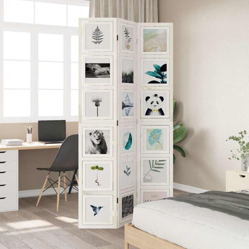 Внесете елегантност и привлекателен декоративен щрих във вашето пространство с тази очарователна преграда за стая. Издръжлив и лесен за почистване: Параванът за поверителност е изработен от масивно дърво от пауловния, което го прави лесен за почистване и издръжлив. Рамката от масивно дърво пауловния гарантира здравина и стабилност. Масивното дърво от пауловния е красив естествен материал. Дървесината от пауловния е силно устойчива на насекоми и гниене.Гъвкав и лесен за сгъване: Всяка преграда е свързана с 3 метални панти, а горният и долният панел са свързани чрез скрити панти 2 в 1. Така панелът за разделяне на стая може лесно да се сгъне до известна степен според вашите нужди, за да спестите място.Атрактивен дизайн: Всяка рамка за снимки може да се върти вертикално, което ви позволява да подредите любимите си снимки във всяка позиция, превръщайки се в акцента на стаята.Многофункционален: Преградата за стая е чудесна за създаване на лично пространство във вашата спалня, всекидневна, офис и други интериори. Можете също да го поставите пред прозорец, за да блокира интензивната слънчева светлина. Внимание:Само за вътрешна употреба. Добре е да знаете:Всяка въртяща се рамка има отворен дизайн и не включва предварително зададени декоративни снимки и стъкло. Можете да я персонализирате, като поставите свои снимки през отвора отстрани на рамката, за да създадете уникален, индивидуален външен вид.