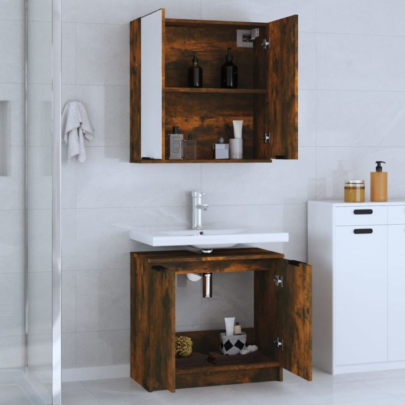 Комплект шкаф за баня от 2 части, опушен дъб, инженерно дърво