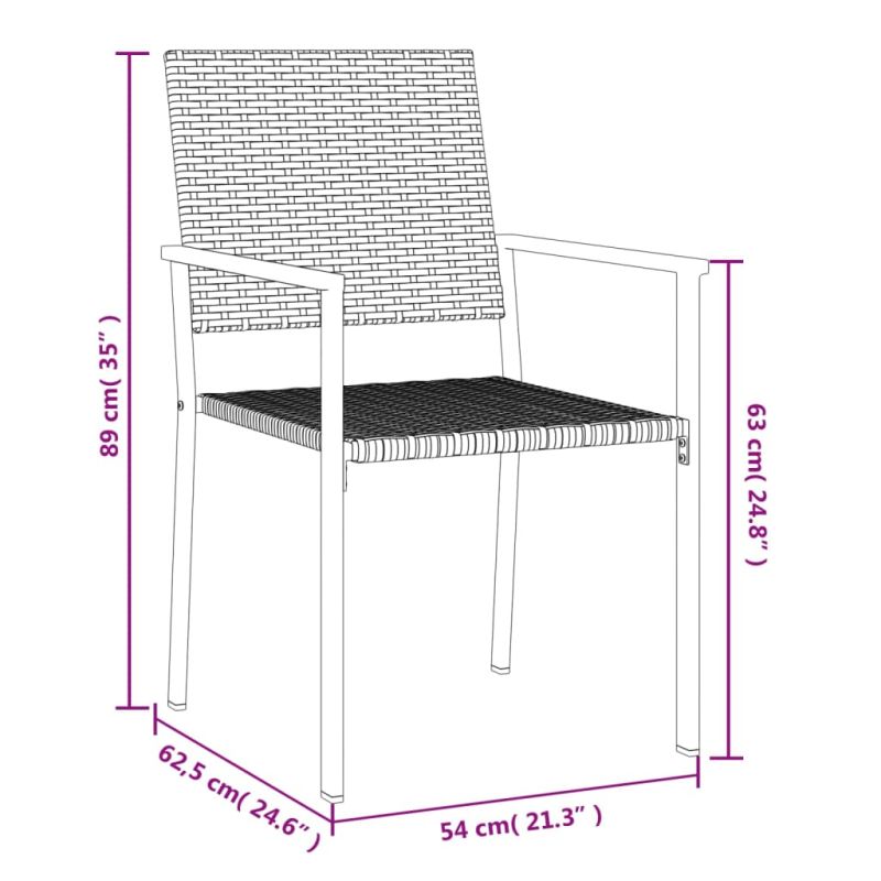 Тези стилни градински столове са идеалното допълнение към вашата градина и тераса, създавайки трайно впечатление! Издръжлив материал: PE ратан, известен също като полиратан, е устойчив на атмосферни влияния и лесен за почистване. Той остава красив отвън за дълъг период от време. Предлага отлично качество, удобство и естетичен вид.Здрава рамка: Стоманената рамка прави градинския стол здрав и стабилен за ежедневна употреба на открито.Удобно седене: Облегалката и подлакътниците добавят допълнителен комфорт при седене на външния стол. Забележка:За да сте сигурни, че вашите външни мебели ще останат красиви, ви препоръчваме да ги защитите с водоустойчиво покривало. Максимално 110 кг на седалка.