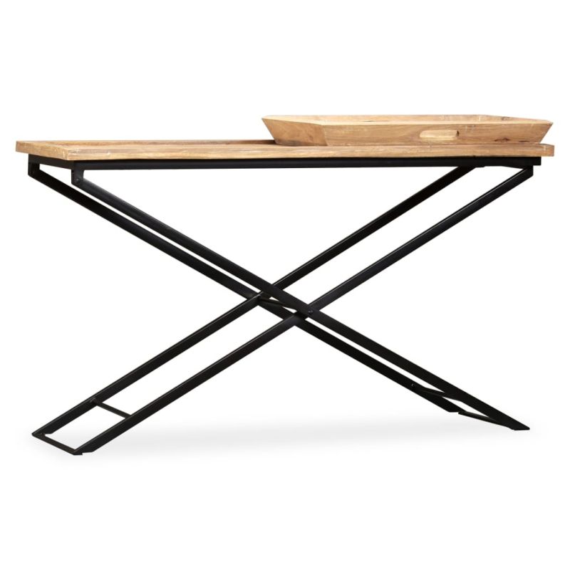 Тази конзолна дървена маса в индустриален стил ще бъде практична и декоративна добавка към вашето антре, всекидневна или трапезария. Плотът на масата е изработен от мангово дърво масив, завършено чрез шлифоване за издръжливост. Прахово боядисаните стоманени крака имат X-образен дизайн, допринасящ за една чудесна стабилност. Масата за антре има две дървени тави за поставяне на декоративни предмети, като купи с плодове или вази, като те могат лесно да бъдат отстранени за отделно използване, когато е необходимо. Монтажът е лесен.