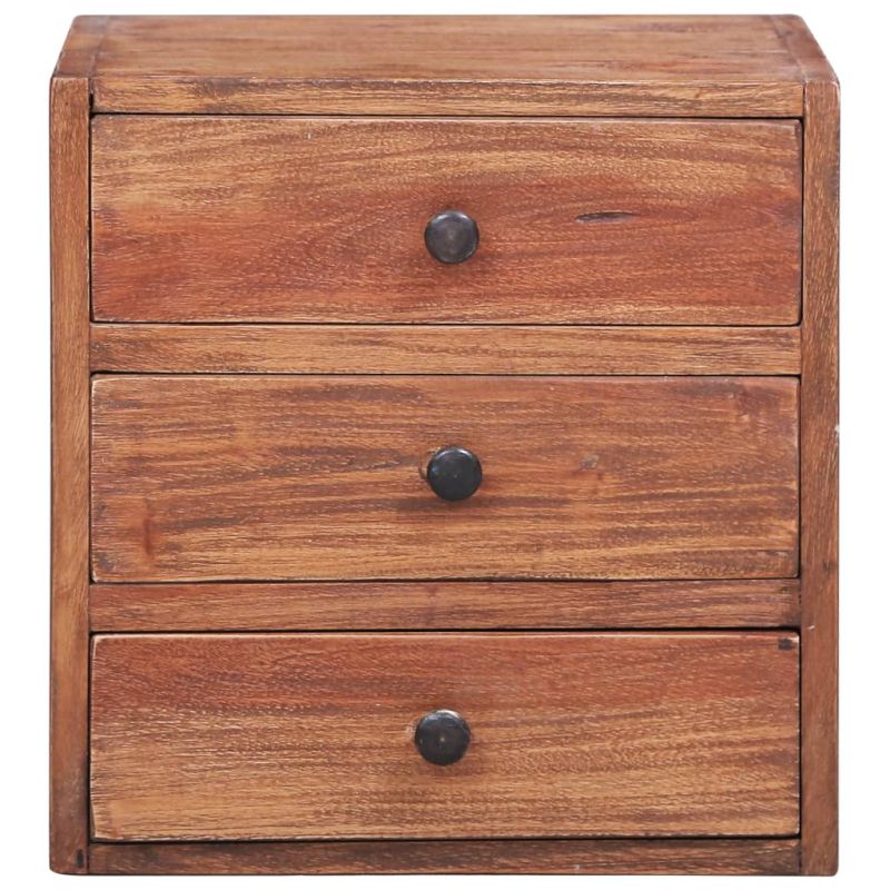 Внесете рустикална нотка в интериора си с нашето дървено нощно шкафче! Това отличително нощно шкафче с 3 чекмеджета ви помага да поддържате вещите си в отличен ред. Изработено от масивна махагонова дървесина, това нощно шкафче от масивна дървесина е изключително издръжливо и здраво. Махагонът е тропическа твърда дървесина, която се отличава със своята красота, издръжливост и цвят. Използвана е специална изработка, за да се придаде на този артикул винтидж, топъл и автентичен вид. Нощното шкафче се сглобява лесно. Важна забележка: Дървесната структура и цветовете могат да се различават при всяка мебел, което прави всяко от нашите нощни шкафчета уникално. Доставката е на случаен принцип, което гарантира ексклузивността и индивидуалността на вашия продукт.