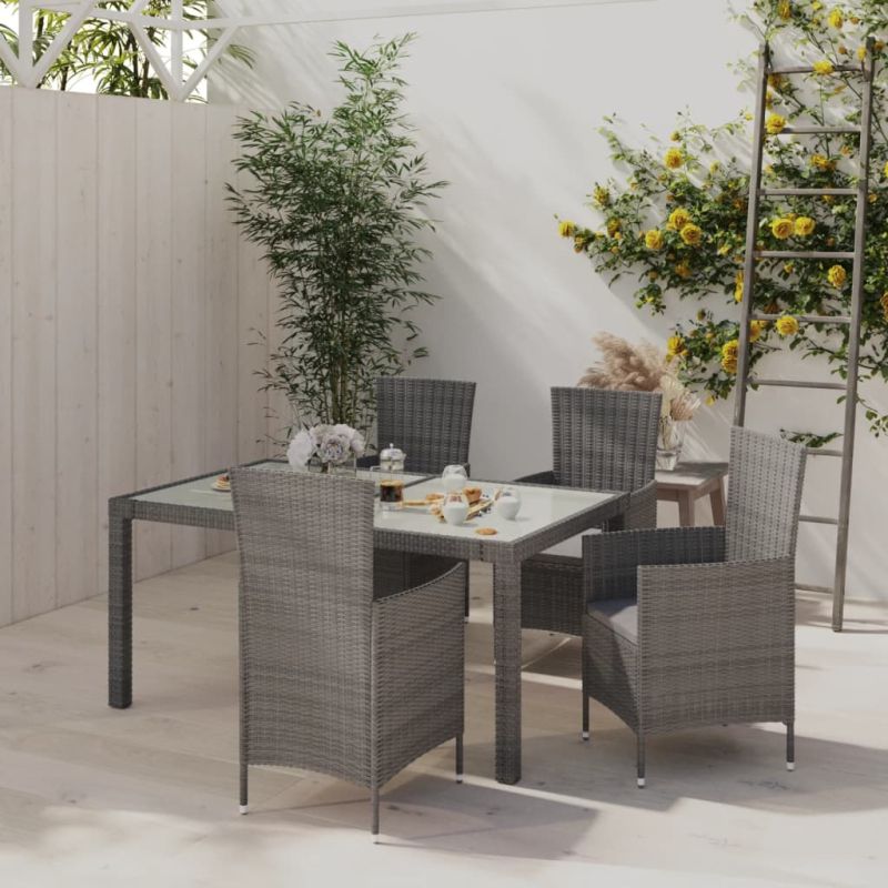 Със стилен дизайн и издръжлива стоманена рамка, този комплект трапезни мебели е перфектен избор за вашето външно жилищно пространство. Този градински трапезен комплект разполага с прахово боядисана стоманена рамка, която прави масата и столовете стабилни и издръжливи. Благодарение на устойчивия на атмосферни влияния PE ратан, комплектът мебели за открито се почиства лесно. Възглавниците са подвижни и лесни за почистване. В допълнение, плътните възглавници добавят допълнителен комфорт при седене. Забележка: За да удължите живота на вашите градински мебели, ви препоръчваме да ги защитите с водоустойчиво покривало. Максимално 110 кг на седалка. Съобразете се с риска от открит огън и други източници на силна топлина в близост до продукта.