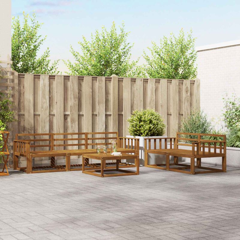 Този модерен комплект открит ъглов диван е точно това, от което се нуждаете, за да направите вашата градина, патио или край басейн централно място. Със своя стилен дизайн и удачно съчетание на удоволствие и функция, кафявите му тонове и скрития гръб придават лукс на откритите пространства, създавайки перфектна зона за сядане за всякакви събития или тихи моменти. Независимо дали е под чадър или на слънце, този комплект ще преобрази всяка среда със своето безвремие, канейки всеки да се отпусне и да се наслади на удоволствието от откритото. Масивна акациева дървесина: Направен от първокласна масивна акациева дървесина, този комплект дивани излъчва естествена красота и здравина. С доказаната си устойчивост и красиви зърна, акациевата дървесина е идеална за открито, тъй като е устойчива на атмосферни условия и ежедневна употреба. Природната лъскавина на дървесината добавя елегантност и не изисква много поддръжка, което я прави сладък избор за всеки стилен дом. Слатен гръб: С елегантен слатен гръб, този комплект дивани комбинира красота и удобство. Този дизайн позволява циркулация на въздуха и придава по-освежаващо усещане на вашето пространство. Поддържащата облегалка предлага комфорт, а красивия вид създава уютна атмосфера на открито, перфектна за развлечения или релакс. Фиксирана слатена рамка: Здравата и фиксирана слатена рамка осигурява стабилност и надеждност, които ще ви служат години напред. Този дизайн е перфектен за открито, където е нужна здрава опора. Конструкцията на рамката допълва стила на дивана, създавайки единно визуално излъчване, което акцентира на здравината и съвременния вид. Устойчив на времето: Проектиран да издържа на теста на времето, този комплект е направен да понася различни метеорологични условия. От слънчеви следобеди около басейна до ветровити вечери в градината, материалите и дизайнът осигуряват допълнителна защита, така че диванът да остане удобен и привлекателен през целия сезон. Модулна конфигурация: Модулният дизайн на комплета ви позволява да настроите подредбата по ваш вкус, в зависимост от настроението или повода. Можете лесно да създадете интимна обстановка или да разширите местата за сядане. Тази гъвкавост осигурява комфорт и позволява адаптация към нуждите на вашия начин на живот, добавяйки стил и функционалност.