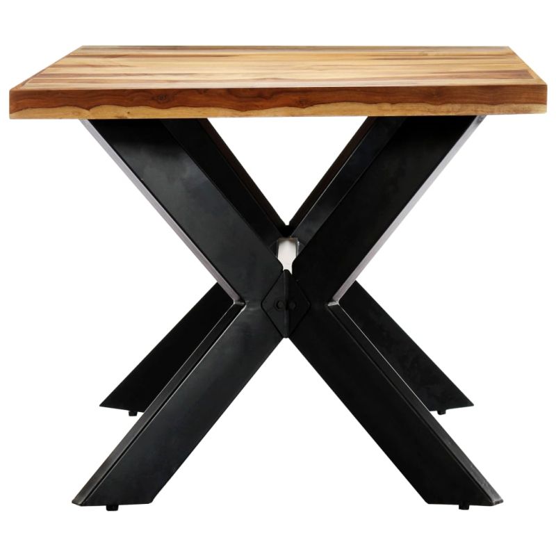 Тази стилна дървена трапезна маса в индустриален стил ще бъде отличително допълнение към вашата кухня или трапезария. Тази трапезна маса е изработена от масивно акациево дърво. Акацията е твърдо тропическо дърво, която е известно с богатите си шарки, познато още като розово дърво или палисандър. Трапезната маса е изцяло ръчно изработена, а всяка стъпка от процеса се извършва с най-голямо внимание, било то полиране, боядисване или лакиране. Стоманените крака допълват индустриалния вид, заедно със стоманената кръстата рамка, която допринася за здравата конструкция. Трапезната маса се сглобява лесно. Важна забележка: Цветовете могат да варират при всеки артикул, което прави всяка от трапезните маси уникална. Доставката е на случаен принцип, което гарантира ексклузивността и индивидуалността на вашия продукт.