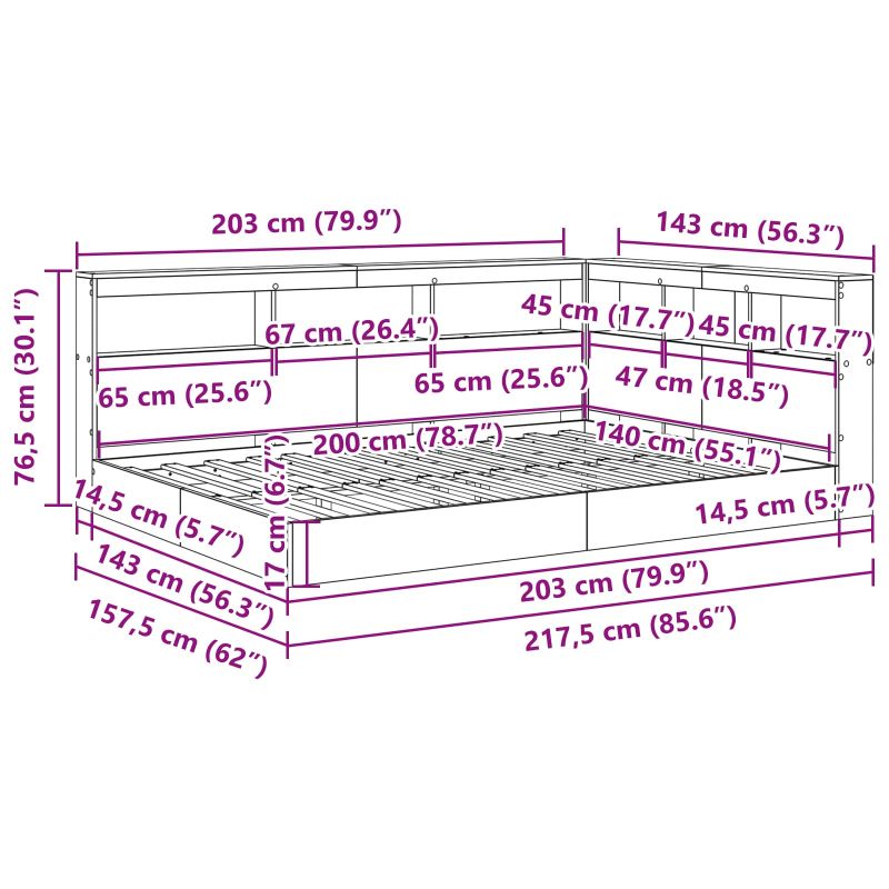 Легло с библиотека Бетонно сиво 140 x 200 cm Инженерно дърво
