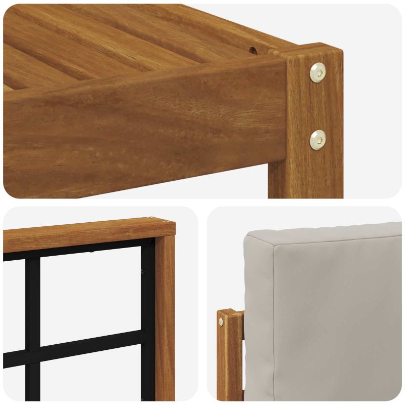 Този комплект за открит секционен диван е наистина страхотно допълнение за всяка градина или тераса. Направен е от здрава акациева дървесина и предлага стабилна конструкция, която е дълготрайна дори на открито. Рамката е проектирана с пукнатини, които не само изглеждат добре, а и осигуряват допълнителна вентилация, така че да е удобно за почивка и социални събирания. Чистите кафяви нюанси на рамката и повърхността отлично допълват съвременния му дизайн, идеален за събирания под слънцето с близки. Материали: Рамката, подлакътниците и гърба са направени от масивна акациева дървесина, което осигурява здравина и естествено усещане. Акациевата дървесина е известна със своята дълготрайност и способност да устои на времето, така че можете да се насладите на откритите условия без проблем. Включени компоненти: Просторният дизайн предлага ергономични подлакътници и поддържащ гръб, което прави употребата много удобна. Устойчивата повърхност предлага стабилна основа за възглавничките и добавя стилен акцент на визията. Характеристики / Функция / Дизайн: Дизайнът с пукнатини е важен и за форма, и за функция. Той не само изглежда модерно, но и позволява удобно оттичане и циркулация на въздуха, намалявайки натрупването на влага. Минималистичната декорация подчертава съвременната естетика. Препоръчителни употреби: Идеален за градини и тераси, този диван е перфектен за летни събирания или спокойни вечери с книга. Може да се ползва за вечеря на открито или за приятни разговори с близки. Поддръжка и поддържане: Можете да почиствате с мека, суха кърпа, за да премахнете прах и мръсотия и да запазите блестящия вид на мебелите. При лошо време помислете за използване на покритие, за да защитите естествения вид на дървото. Редовната грижа ще удължи живота на дивана и ще ви радва дълго време.