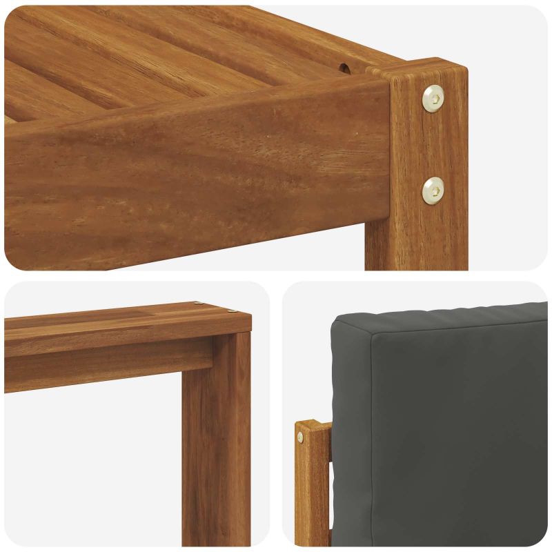 Този комплект за открито е съчетание от стил и практичност. Създаден за романтики на открито, дизайнът му е изчистен и елегантен, разкривайки красивите природни нюанси на масивната акациева дървесина. Където и да го поставите, той ще преобрази всяка градина в уютно местенце. Перфектен за семейства или гости, предлага лекота и комфорт, приканвайки всички да се задържат и насладят на слънчевите следобеди. Издръжлива масивна акация: Направен изцяло от масивна акациева дървесина, този диван комплект е здрав и устоява на всички метеорологични условия. Естествените масла в акацията предлагат защита от климатичните промени, предоставяйки спокойствие за любителите на открито. Елегантен плоскостен дизайн: Плоската облегалка и седалка улесняват циркулацията на въздуха, осигурявайки комфорт дори в горещите следобеди. С модерен вид, забавлявайте се с удобно сядане. Ергономични подлакътници: Проектирани да предлагат удобна поза, тези подлакътници ще ви помогнат да се настаните с лекота. Изработени от масивна акация, съчетават стил и комфорт. Функционален модерен стил: Диванът е подходящ за различни градински и терасови стилове. С простия си дизайн, той е както практичен, така и елегантен, идеален за тези, които обичат съвременните корекции. Изисквания за сглобяване: За най-добри резултати, сглобяването е по-добре да се направи от двама души, изискващи отвертка. Това осигурява запазване на качеството и дълготрайност.