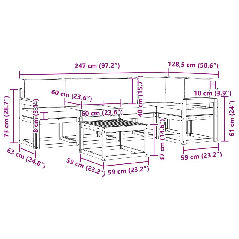 • 4 x Среден диван: 59 x 63 x 73 см (Д x Ш x В)
