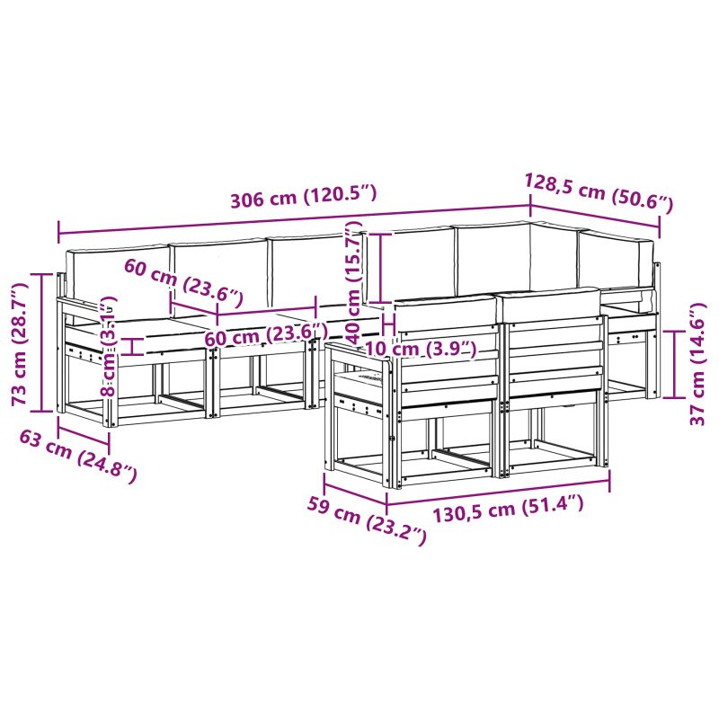 • 7 x Среден диван: 59 x 63 x 73 см (Д x Ш x В)