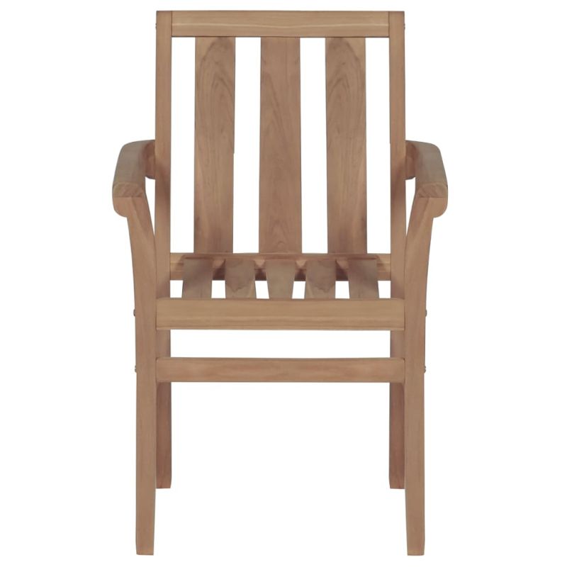 Този градински комплект дървени стифиращи столове има класически дизайн. Столовете могат да се използват в голямо разнообразие от подредби, като домове, офиси, барове и кафенета благодарение на своя семпъл, но стилен дизайн. Този комплект мебели от тик е изработен от изключително издръжлива тикова твърда дървесина, която е суха – изсушена в пещ, а след това фино шлифована, за да ѝ се придаде много гладък вид. Тиковото дърво е известно с изключителната си здравина и устойчивост на атмосферни влияния, което го прави далеч по-подходящо за градински мебели от всеки друг вид дърво. Тиковата дървесина е идеалният избор, ако искате да закупите дълготрайна градинска мебел. Тези столове могат да се подреждат един върху друг, когато не се използват, за да се пести място за съхранение. Продуктът е с нанесен красив финиш за придаването на топъл цвят на дървото. Забележка: За да удължите живота на вашите градински мебели, препоръчваме ви да ги почиствате редовно и да не ги оставяте ненужно на открито без защита.Почистване: Използвайте мек сапунен разтворСъхранение: Ако е възможно, съхранявайте на хладно и сухо място на закрито. Ако продуктът се съхранява на открито, защитете го с водоустойчиво покривало. Избършете и изсушете излишната вода или сняг от плоските повърхности след дъжд или снеговалеж. Позволете достатъчно циркулация на въздуха, за да избегнете повреди, свързани с влагата. Максимално 110 кг на седалка.