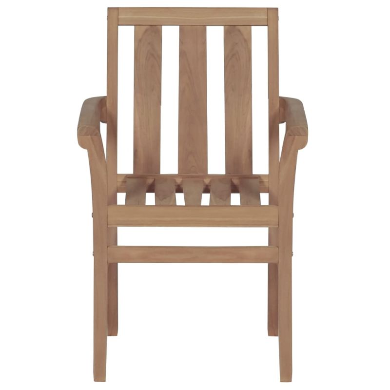 Този градински комплект дървени стифиращи столове има класически дизайн. Столовете могат да се използват в голямо разнообразие от подредби, като домове, офиси, барове и кафенета благодарение на своя семпъл, но стилен дизайн. Този комплект мебели от тик е изработен от изключително издръжлива тикова твърда дървесина, която е суха – изсушена в пещ, а след това фино шлифована, за да ѝ се придаде много гладък вид. Тиковото дърво е известно с изключителната си здравина и устойчивост на атмосферни влияния, което го прави далеч по-подходящо за градински мебели от всеки друг вид дърво. Тиковата дървесина е идеалният избор, ако искате да закупите дълготрайна градинска мебел. Тези столове могат да се подреждат един върху друг, когато не се използват, за да спестят място за съхранение. Продуктът е с нанесен красив финиш за придаването на топъл цвят на дървото. Освен това включените възглавници осигуряват допълнителен комфорт. Всяка възглавница е снабдена с 2 комплекта връзки за плътно закрепване към стола. Забележка: За да удължите живота на вашите градински мебели, препоръчваме ви да ги почиствате редовно и да не ги оставяте ненужно на открито без защита.Почистване: Използвайте мек сапунен разтворСъхранение: Ако е възможно, съхранявайте на хладно и сухо място на закрито. Ако продуктът се съхранява на открито, защитете го с водоустойчиво покривало. Избършете и изсушете излишната вода или сняг от плоските повърхности след дъжд или снеговалеж. Позволете достатъчно циркулация на въздуха, за да избегнете повреди, свързани с влагата. Максимално 110 кг на седалка.
