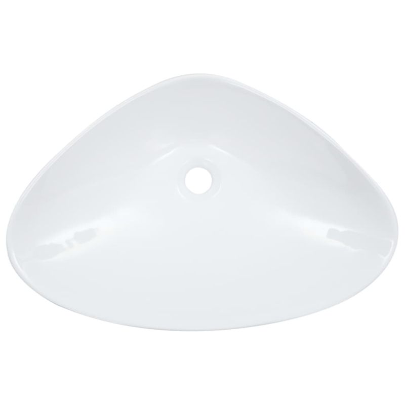 Изработена от керамика, тази триъгълна мивка ще бъде изискано и непреходно допълнение към всяка баня, тоалетна, гримьорна или мокро помещение. Умивалникът може да служи не само като аксесоар за ежедневна употреба, но и за украса на жилището ви. Благодарение на модерния и съвременен дизайн, тази мивка определено ще подхожда на всеки интериор. Изработена от керамика, тя се почиства сравнително лесно. В допълнение гланцираната повърхност придава очарователен щрих на тази мивка за баня. Моля, отбележете, че смесителният кран и сифонът не са включени в доставката. Децата трябва да бъдат наблюдавани, за да се гарантира, че не играят с уреда. Пазете децата далеч от зоната за сглобяване. Внимание: Прочетете внимателно инструкциите преди употреба и ги запазете за по-нататъшни справки.
