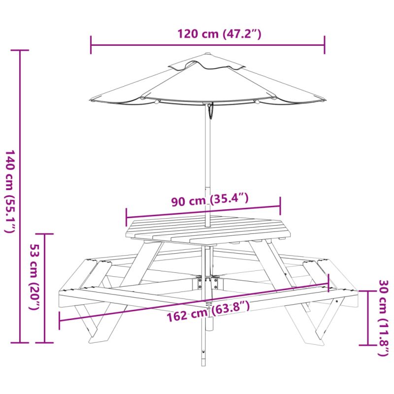 Тази маса за пикник с чадър е идеална за вътрешни дворове, градини и открити пространства, като осигурява удобно и привлекателно място за почивка и забавление на децата и техните приятели. Комплект маса и пейки 2-в-1: Масата за пикник с пейки е идеална за детски партита и събирания, тъй като осигурява достатъчно място за храна, напитки и аксесоари, както и удобни места за сядане, за да могат децата да се наслаждават на детските си спомени.Надежден и стабилен материал: Тази маса за пикник е изработена от масивна чамова дървесина, което гарантира стабилност, издръжливост и дълготрайност.Защита от слънце и дъжд: Изработен от издръжлив полиестер, външният чадър предлага защита от слънце и дъжд, създавайки идеално място за децата, където да се наслаждават на времето на открито. Добре е да се знае:Този продукт не е подходящ за употреба при лоши метеорологични условия, като силен вятър, силен дъжд, сняг, бури и др. Предупреждение: НЕ поставяйте този продукт близо до прозорец, тъй като той може да бъде използван като стълба от деца и те да паднат от прозореца. Бъдете внимателни по отношение на риска от открити огньове и други източници на силна топлина в близост до продукта. НЕ поставяйте този продукт близо до прозорец, където шнуровете от щорите или завесите могат да удушат дете. Предупреждение! Да се сглобява единствено от възрастни. Съхранявайте продукта и всички негови части далеч от деца до момента на сглобяването. Уверете се, че сте осъзнали цялата отговорност, тъй като несглобеният продукт съдържа малки части и потенциално опасни остри ръбове. Предупреждение! Да се използва под директния надзор на възрастни. Предупреждение! Максималната товароносимост е 80 кг. Предупреждение! Този продукт е подходящ само за деца над 3-годишна възраст.