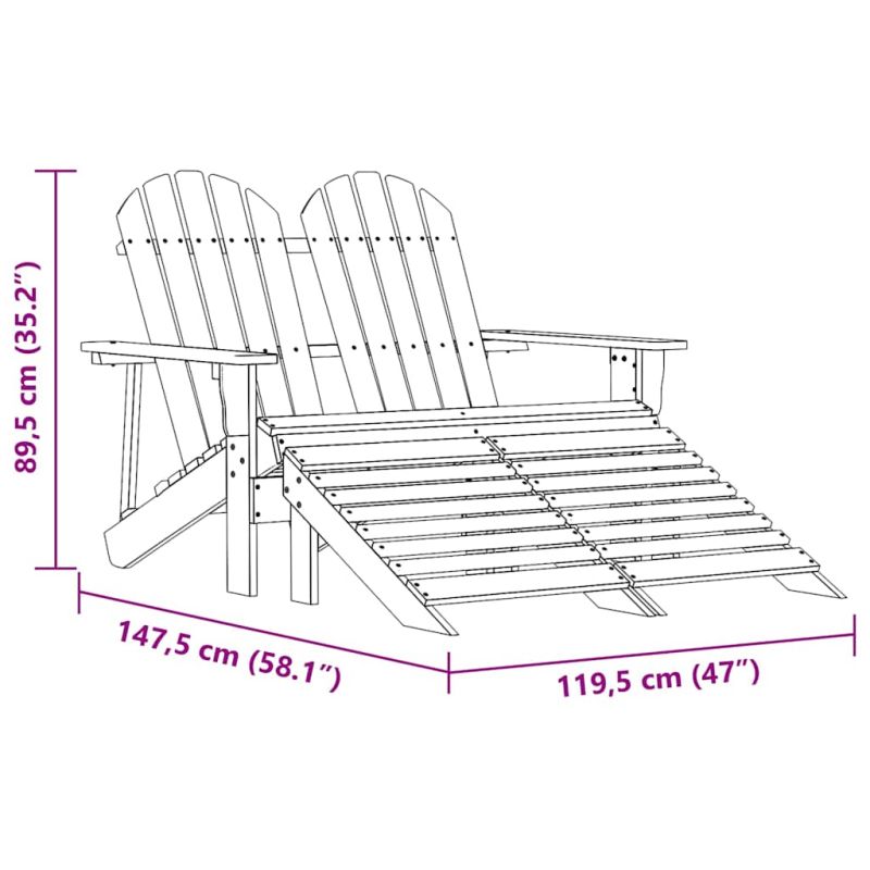 Отпуснете се и релаксирайте в градината или във вътрешния двор с този модерен и удобен стол Adirondack с табуретки! Този 2-местен градински стол, изработен от масивна ела, има здрава рамка и е стабилен, което го прави лесен за поддръжка и устойчив на атмосферни влияния. Ергономично проектираната структура също така осигурява оптимален комфорт. Освен това табуретките са подвижни и могат да осигурят допълнителна опора за краката ви. С елегантен и вечен дизайн, той ще бъде практично и класическо допълнение към вашето външно жилищно пространство. Забележка: За да удължите живота на вашите градински мебели, ви препоръчваме да ги защитите с водоустойчиво покривало. Максимално 110 кг на седалка.