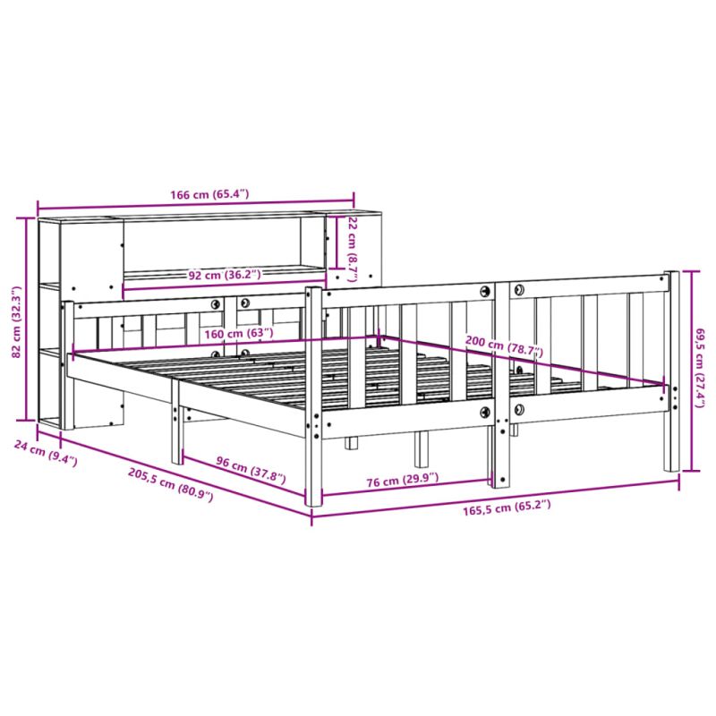 Легло с етажерка за книги, без матрак, 160x200 см, дърво масив