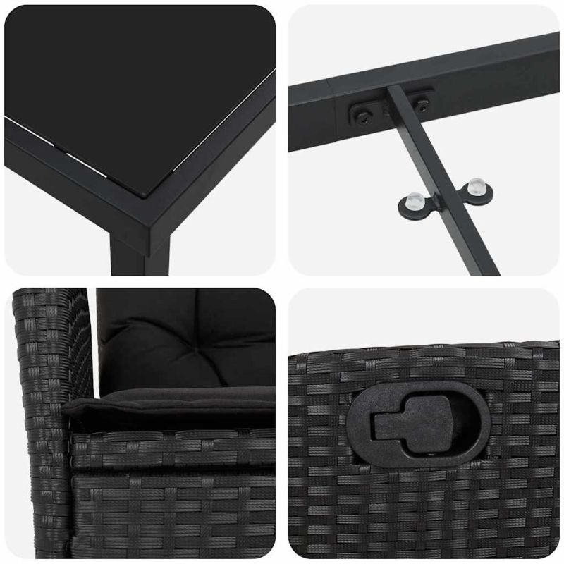 Модерният комплект за градинска трапезария е тук, за да придаде изтънчен вид на всяка тераса, веранди или градина. Създаден да бъде за летния сезон, той обединява простота и функционалност с комбинация от полиратан, стъкло и стомана. Текстурата на полиратана добавя стил към външното пространство, докато здрава стоманена рамка гарантира, че сме готови за всички летни забавления и хранене на открито. Идеалният избор за уютни семейни обеди или приятелски срещи под открито небе. Издръжлива конструкция: Създаден с качествени материали, нашият комплект за градинска трапезария е устойчив на всякакви метеорологични условия. Полиратанът е супер за седалките, предоставяйки удобство, а стоманената рамка дава стабилност и поддържа всичко на място дори с времето. Стъклени повърхности на масата: Завършена с черна стъклена повърхност, масата предостявя шикозно и лесно за поддържане пространство за хранене. Просторната стъклена маса не само добавя стил, но и е идеална основа за декорации. Този елемент увеличава както функционалността, така и естетиката. Регулируем комфорт: С многопозиционната облегалка направихме удобството приоритет. Ръчното регулиране ви позволява да се отпуснете в удобни позиции, идеално за дълги часове с близките. Работим за вашата наслада и добрата форма на един невероятен комплект. Ергономичен дизайн: Леко извити полиратанови подлакътници и изчистен дизайн на краката се комбинират за един модерен вид. Всеки елемент е добре обмислен, за да осигури удобство и ергономично изживяване, без да се жертва стилът. Седалките предлагат комфорт без компромиси. Грижа за мебелите: Препоръчваме да покривате комплекта, когато не го използвате, особено при неблагоприятно време. Грижейки се за това, можете да удължите живота и елегантността на комплекта. Следвайте тези прости стъпки, за да запазите формата му за по-дълго време. Максимално 110 кг на седалка. Съобразете се с риска от открит огън и други източници на силна топлина в близост до продукта.