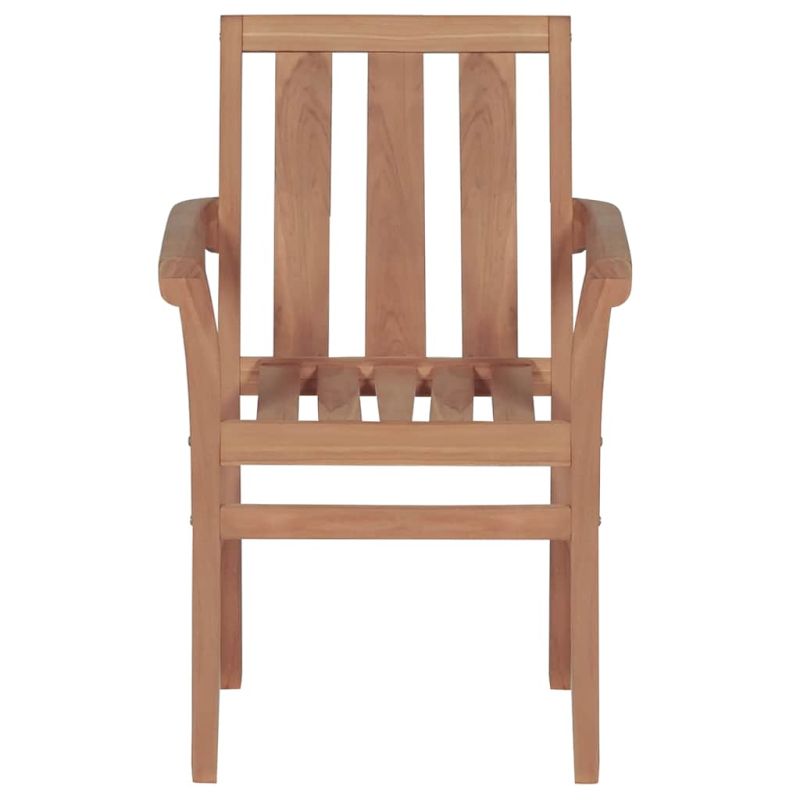 Този стилен комплект, състоящ се от 2 дървени градински стола, има класически дизайн. Градинските столове са подходящи за всякакви подредби, както у дома, така и в офиси, барове и кафенета, благодарение на своя семпъл, но стилен дизайн. Тази мебел от тик е изработена от изключително издръжлива тикова твърда дървесина, която е суха – изсушена в пещ, а след това фино шлифована, за да ѝ се придаде много гладък вид. Тиковото дърво е известно с изключителната си здравина и устойчивост на атмосферни влияния, което го прави далеч по-подходящо за градински мебели от всеки друг вид дърво. Тиковата дървесина е идеалният избор, ако искате да закупите дълготрайна градинска мебел. Тези столове за двор могат да се поставят един върху друг, за да се пести място за съхранение, когато не се използват. Продуктът е завършен с красив финиш, който да придаде на дървото топъл цвят. Включените възглавници на седалките също осигуряват допълнителен комфорт при седене. Максимално 110 кг на седалка.