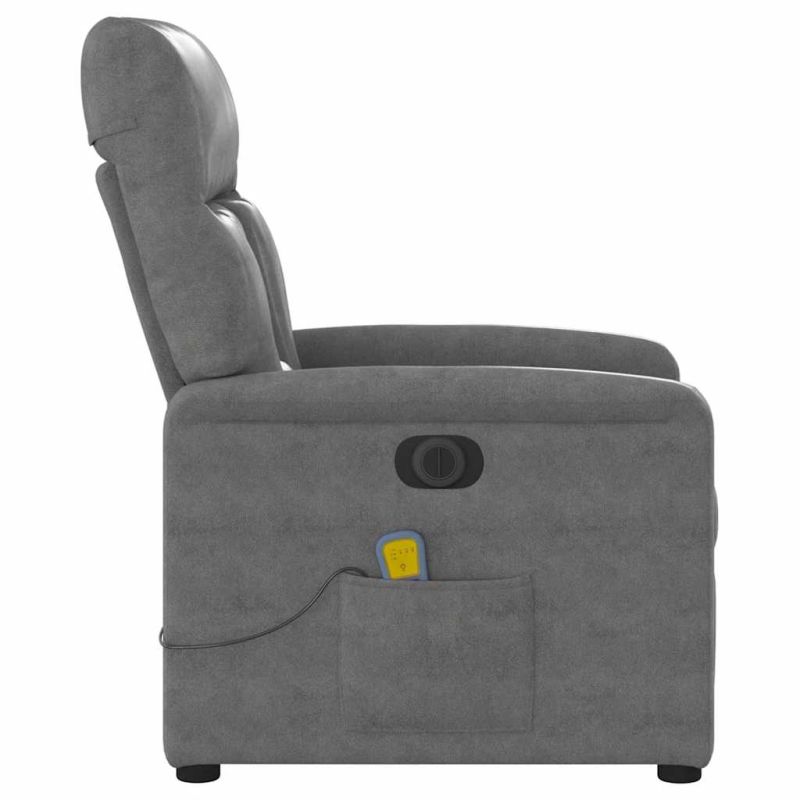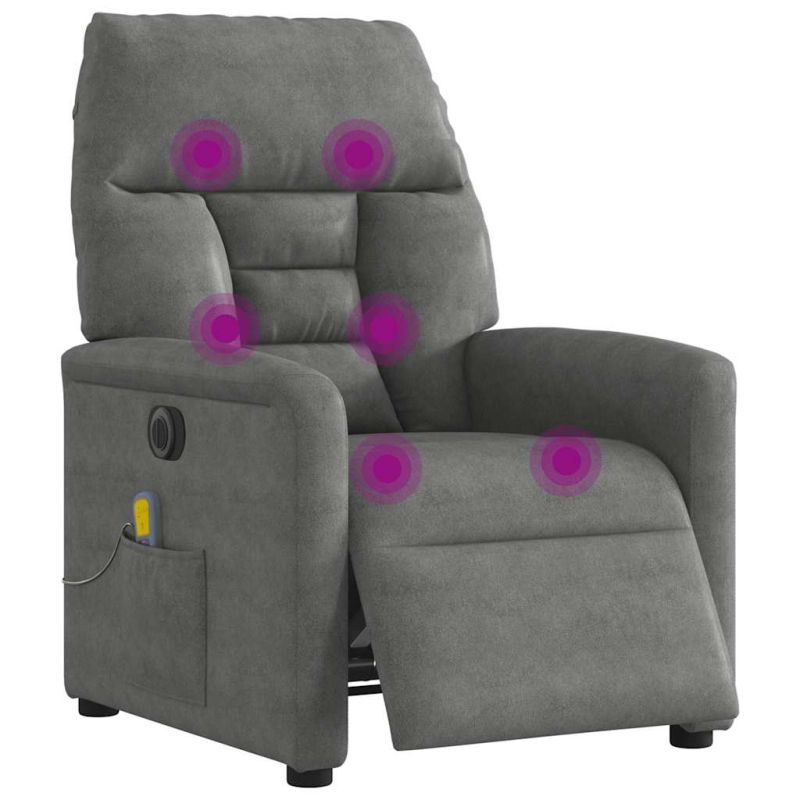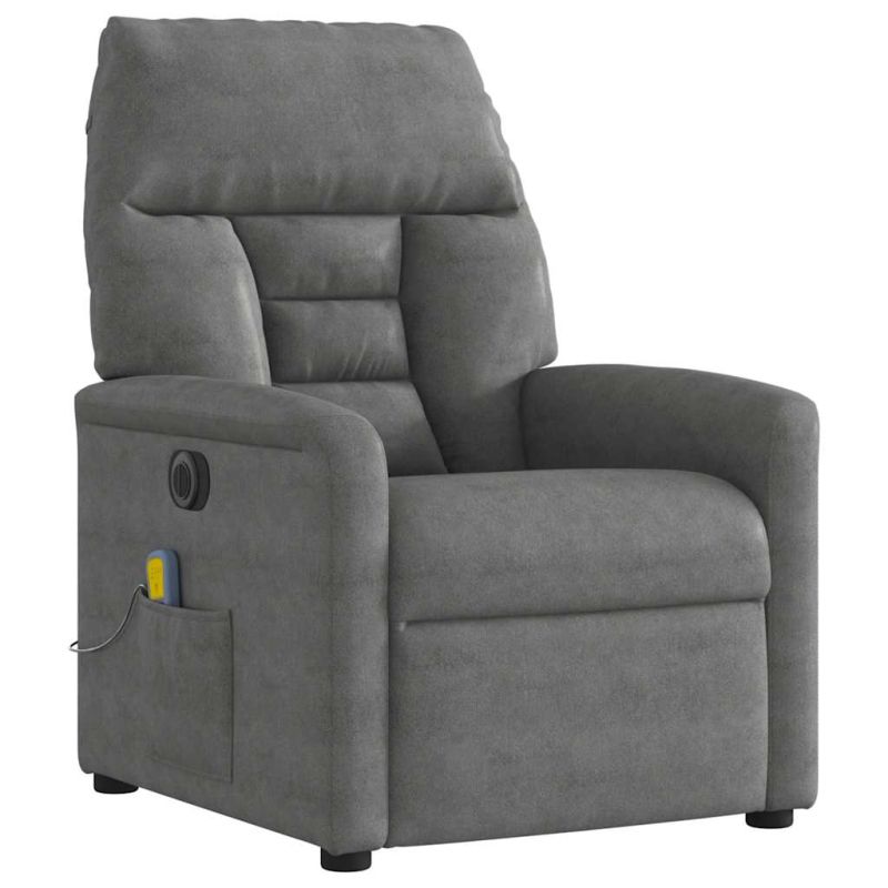 Облегнете се и се отпуснете в този изключително комфортен електрически масажен реклайнер стол! Електрическа функция за накланяне: Този стол с облегалка е оборудван с електрически мотор, който помага автоматично да регулирате поставката за крака и облегалката до произволна позиция според вашето удобство с просто натискане на бутона отстрани на стола. Тази функция позволява максимален наклон от 135 градуса. Освен това облегалката може да се върне автоматично на първоначалното си място с лесно натискане на бутона.Функция за вибрация: Представените 6 масажни точки ви позволяват да изпитате по-целенасочен масаж. Освен това включеното ръчно управление ви позволява да избирате различни програми за масаж. Функцията за масаж се захранва от USB конектор, който изисква сертифициран 5V USB захранващ източник (не е включен).Удобно седене: Дебело подплатената седалка, облегалката и широките подлакътници, покрити с текстил, осигуряват уютно и топло усещане, което ви кара да се чувствате като в прегръдка, докато седите. Микрофибърът е синтетична тъкан, състояща се от ултрафини влакна, които са особено устойчиви на петна. Микрофибърната тъкан е чудесен избор за мебелна тапицерия, благодарение на своята издръжливост и лесно почистване.Здрава и стабилна рамка: Рамката, изработена от дърво и метал, осигурява здрава структура и стабилност. Този накланящ се фотьойл е удобен и издръжлив. Този уред може да се използва от деца на възраст от 8 години и нагоре, както и от лица с намалени физически, сетивни или умствени способности или с липса на опит и познания, ако са получили надзор или инструкции относно използването на уреда по безопасен начин и разбират свързаните с него опасности. Децата не трябва да си играят с уреда. Децата не трябва да извършват почистване и поддръжка без надзор. Моля, обърнете внимание да използвате само сертифициран вход за постоянен ток 5V. По-високото напрежение може да доведе до прегряване и повреда на устройството и потенциален риск от пожар.
