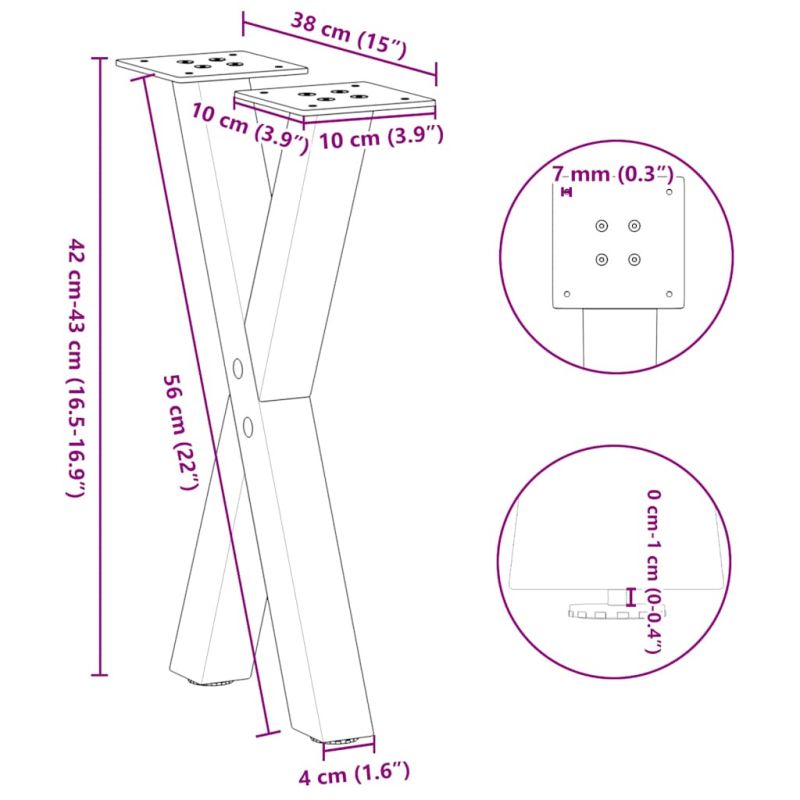 Тези крака за масичка за кафе съчетават форма и функция. Това е идеален избор за персонализиране на вашата масичка за кафе. Издръжлив материал: Този крак за мебелна маса е изработен от прахово боядисана стомана, което го прави здрав и дълготраен.Здрава конструкция: X-образният дизайн на металния крак на масата гарантира, че той може да поддържа тежък плот.Практичен дизайн: Този крак за бюро включва регулируеми нивелири, осигуряващи стабилност дори на неравни подове и минимизиращи драскотините по пода. Освен това, скобата е с предварително пробити отвори и включени в доставката винтове, които могат да се използват за закрепване на крака към плота на масата (не са включени), което улеснява сглобяването.Модерна естетика: Кракът на масата има изчистени линии и геометричен дизайн, за да подобри цялостния вид на мебелите. И се съчетава добре с всеки плот за маса с подходящ размер. Полезно е да знаете:Доставката съдържа само крака за маса, плотът не е включен.