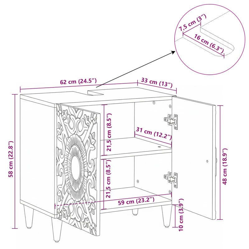 Този шкаф за мивка в банята съчетава простота и функционалност, добавяйки модерен стил с чисти линии и минимална декорация. Стилната правоъгълна форма и двуцветният дизайн с **кафяви врати** и **черни крака** му придават елегантен вид, идеален за бани, които имат нужда от стил и полза. Врати от масивно мангово дърво: Шкафът разполага с красиви врати от масивно мангово дърво, които добавят естествена елегантност на всяка баня. Манговото дърво е известно със своята здравина и устойчивост, а уникалната му текстура придава топъл и приветлив вид на пространството. Просторни отделения за съхранение: С проектирани големи отделения, този шкаф осигурява идеални пространства за организиране на всичките ви основни неща за банята. Умното разположение на отделенията гарантира ефективност в използването на пространството, позволявайки ви лесно да достигнете до тоалетни принадлежности, кърпи и други лични вещи. Функционални метални крака: Здравите метални крака с класическо черно покритие предлагат стабилна опора и дълготрайност. Тези надеждни компоненти осигуряват дълговечност на шкафа и правят почистването под него много по-лесно. Модерен стил: Съобразен с актуалните принципи на дизайна, шкафът се вписва чудесно в различни модерни декори за бани. Със своята изчистена елегантност и практичност, той добавя визуална привлекателност и създава спокойна атмосфера в банята. Лесни инструкции за поддръжка: Поддържането му е супер лесно - просто трябва да го избърсвате с влажна кърпа. Това помага да остане толкова красив и функционален, колкото в деня, в който е попаднал в дома ви, осигурявайки практичност и стил за години напред.