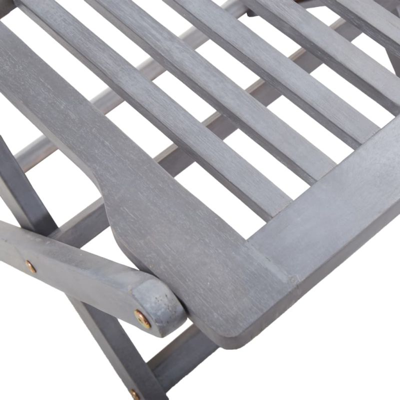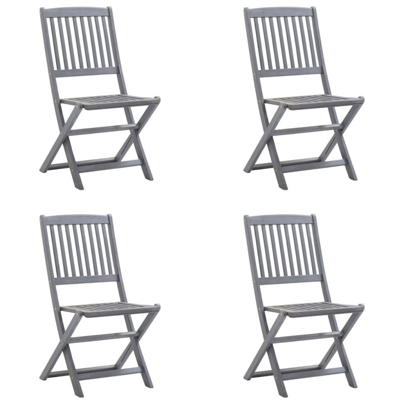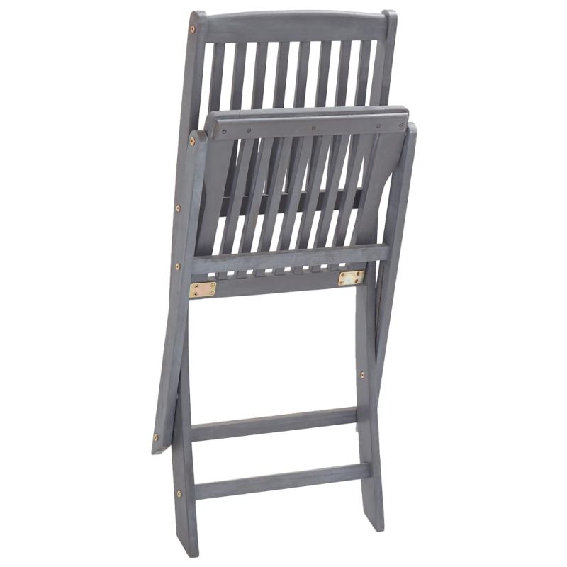 Този модерен комплект дървени трапезни столове с възглавници ще добави щрих на естествен стил към градината, терасата или вътрешния двор. Този комплект сгъваеми столове ще бъде чудесен избор за вечеря. Трапезните столове са изработени от масивно акациево дърво – тропическа твърда дървесина, която ги прави устойчиви на атмосферни влияния и издръжливи за дългогодишна употреба. Масивната акациева дървесина има силата да понесе тежестта и да издържи на износването на времето. Сивата избелена повърхност се почиства лесно с влажна кърпа. Столовете могат да се сгъват, за да пестят място, когато не се използват. Освен това включените възглавници осигуряват допълнителен комфорт при почивка или хранене. Всяка възглавница разполага с два комплекта връзки за плътно закрепване към стола. Максимално 110 кг на седалка.