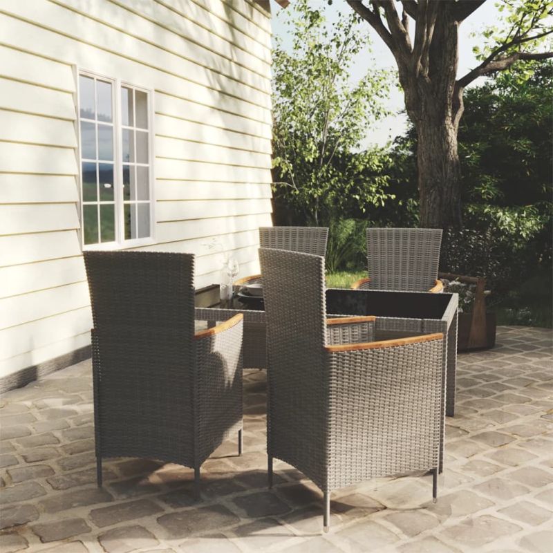 Със стилен дизайн и издръжлива стоманена рамка, този комплект трапезни мебели е перфектен избор за вашето външно жилищно пространство. Този градински трапезен комплект разполага с прахово боядисана стоманена рамка, която прави масата и столовете стабилни и издръжливи. Благодарение на устойчивия на атмосферни влияния PE ратан, комплектът мебели за открито се почиства лесно. Дебелите, подвижни възглавници на седалката допринасят за комфорта на седене и се перат лесно. Забележка: За да удължите живота на вашите градински мебели, ви препоръчваме да ги защитите с водоустойчиво покритие. Максимално 110 кг на седалка. Съобразете се с риска от открит огън и други източници на силна топлина в близост до продукта.