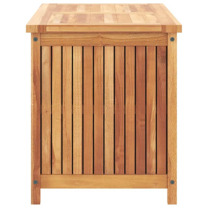 Тази дървена кутия за съхранение в градината излъчва рустик чар и е предназначена да бъде чудесно допълнение към вашето външно или закрито жилищно пространство. Тази мебел от тик е изработена от изключително издръжлива тикова твърда дървесина, която е суха – изсушена в пещ, а след това фино шлифована, за да ѝ се придаде много гладък вид. Тиковото дърво е известно с изключителната си здравина и устойчивост на атмосферни влияния, което го прави далеч по-подходящо за градински мебели от всеки друг вид дърво. Тиковата дървесина е идеалният избор, ако искате да закупите дълготрайна градинска мебел. Нанесен е красив финиш за придаване на топъл цвят на дървото. Сандъкът за съхранение осигурява достатъчно място за подреждане на различни домакински или градински предмети, които да са на една ръка разстояние и прилежно подредени. Освен това кутията има зашита PE торба. Благодарение на водоустойчивата подплата, съдържанието вътре в раклата ще остане сухо. Забележка: За да удължите живота на вашите градински мебели, ви препоръчваме да ги защитите с водоустойчиво покритие.
