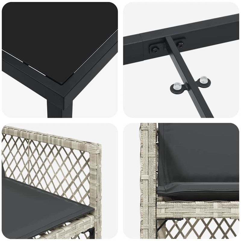 Този модерен комплект за градина е за всички, които ценят простотата и функционалността. Съчетанието на елегантни линии и минималистичен стил го прави привлекателно допълнение за всяка градина или тераса. Представете си да се наслаждавате на уютни вечери на открито, заобиколени от стил и комфорт, с модерен привкус. Гладка повърхност: Масата е от закалено стъкло и осигурява издръжлива плоча, идеална за хранене. Прозрачността й придава усещане за пространство и светлина, което я прави чудесна за неформални ястия и празнични събирания. Издръжлива конструкция: Комплектът е изработен от прахово боядисана стомана, което обещава стабилност и дълговечност. Металната рамка поддържа здравината, нужна за откритите условия, така че да изглежда добре в продължение на години. Комфортни седалки: Полиратановата конструкция осигурява удобство, адаптирайки се приятно към тялото. Идеален е за прием на гости или спокойно време с близките, като канят ви да се отпуснете за дълги разговори. Стилни подлакътници и крака: Новаторските подлакътници и стабилните крака добавят модерен щрих, с минималистичния си дизайн подчертават елегантността на комплекта. Подлакътниците осигуряват опора, а краката дават солидна стабилност за откритото пространство. Лесна поддръжка: Просто покривайте, когато не се ползва, за лесна поддръжка на вида. Избраните материали опростяват грижата за него, така че вие да се радвате на удоволствието без непотребни усилия.