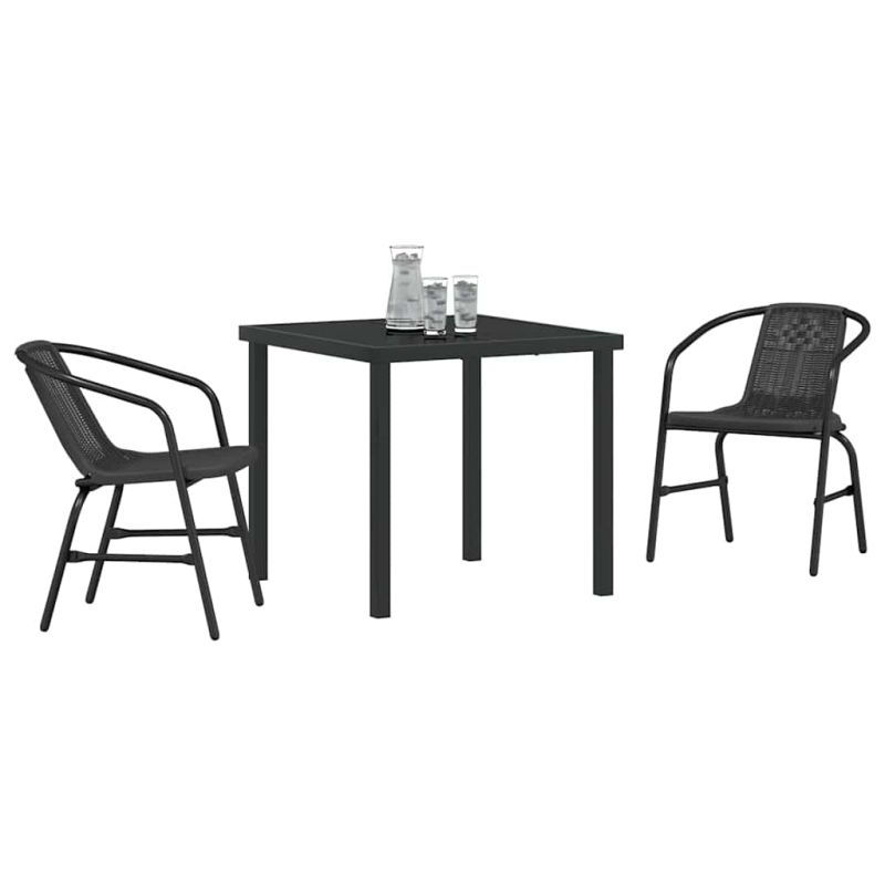 Този стилен комплект градинска маса и столове съчетава елегантност и функция, внасяйки визуална привлекателност с черната си прахово боядисана стоманена рамка. Създаден за открито, той се вписва лесно в градини и тераси, идеален за хранене на открито. Комплектът е подходящ за срещи, предоставяйки приятна обстановка за неформално релаксиране или официални поводи. Формата му и стилът му добавят ценност на всяка открита площ, ставайки централна точка за приятели и семейство да се наслаждават на изчистените линии в дизайна. Качествени материали: Стоманената рамка с прахово боядисване осигурява добра издръжливост и защита от избледняване. Удобният полиратан предлага прекрасна текстура и комфорт. Комбинацията от тези материали осигурява дълготрайност и е инвестиция за открито. Добре дефинирани компоненти: Завършената задница предоставя перспектива от всички ъгли, като интегрира естетика в различни обстановки. Прахово боядисаните подлакътници са удобни, а стъклените повърхности добавят изисканост, лесни за почистване и практични за хранене на открито. Функционални характеристики: Комплектът е проектиран за дълготрайност и организит, който предлага лесно сглобяване и интуитивна употреба. Правоъгълната форма и минималистичен дизайн го правят идеално допълнение за всякакви поводи за хостване. Универсално използване: Подходящ за пролетни и летни събирания, комплектът добре пасва за елегантни градински партита или спокойни семейни вечери на открито. Съвместимостта му през сезона позволява многообразие от неподходящи открити пространства за приятно преживяване на хранене на фона на природата. Лесна грижа и поддръжка: За да поддържате външния вид на комплекта, използвайте покривала, когато не е в употреба, за да предотвратите естественото износване. Редовното почистване е лесно и осигурява дълготрайна привлекателност и функционалност на комплекта за хранене. Максимално 110 кг на седалка.