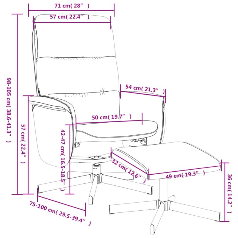 Търсите стол за пълноценна почивка след натоварен ден? Този удобен фотьойл за облягане е идеалният избор! Функция за ръчно накланяне: Този накланящ се стол е специално проектиран с функция за накланяне, така че да можете да регулирате облегалката според вашето удобство. Облегалката може да се накланя от 105 до 125 градуса.Завъртане на 360 градуса: Фотьойлът може да се завърта свободно на 360 градуса, което му придава допълнителна гъвкавост.Удобно седене: Дебело подплатената седалка, облегалката и подлакътници, покрити с текстил, осигуряват уютно и топло усещане, което ви кара да се чувствате като в прегръдка, докато седите. Допълнителната табуретка е подходяща за почивка на краката ви, когато лежите върху реклайнера, което прави този стол удобно място за сядане за всеки повод.Здрава и стабилна рамка: Рамката, изработена от шперплат и метал, осигурява здрава структура и стабилност. Този накланящ се фотьойл е удобен и издръжлив. Добре е да се знае:За да се спести място, някои части или възглавници са опаковани вътре в мебелите - проверете отделенията с цип или под покривалото на седалката за скрити компоненти. Максимално 110 кг на седалка.