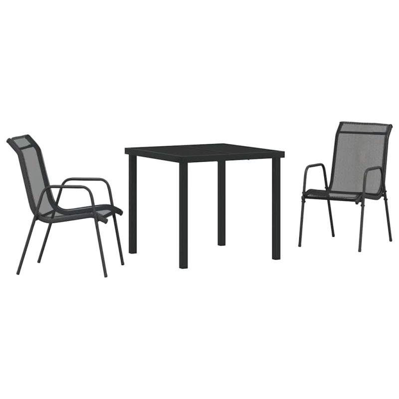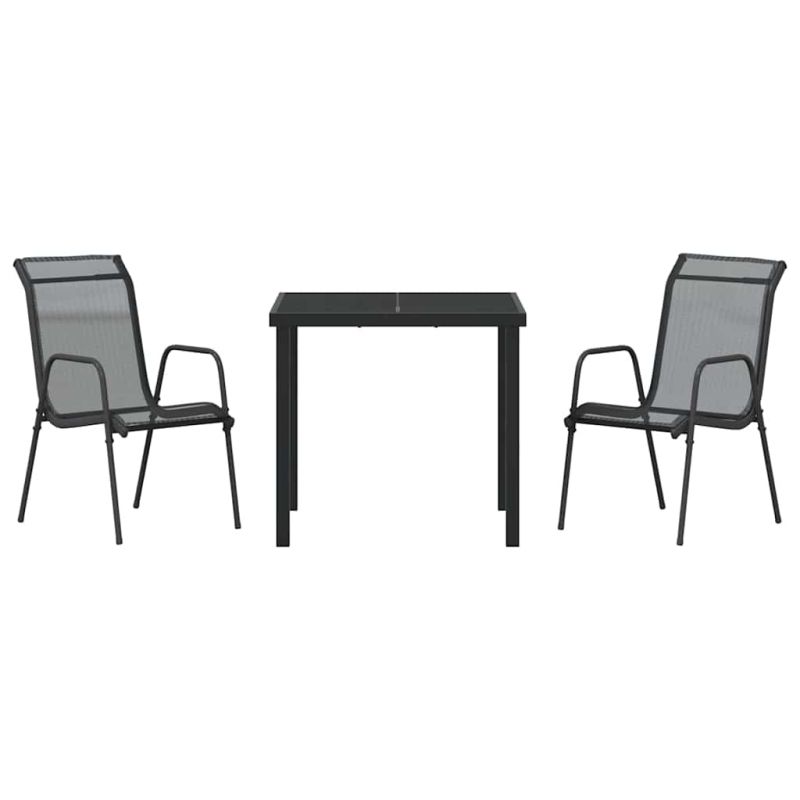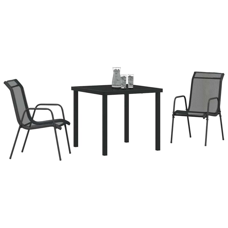 Този съвременен комплект за градината е направен, за да подобри вашите открити събития. Съчетава модерен стил с практичност. Лъскавото черно покритие на стоманената рамка се вписва отлично във всяка градина или тераса, предлагайки универсален вид, който е едновременно елегантен и удобен. Правоъгълната форма и изчистените линии създават перфектен комплект за хранене или просто за почивка на открито. Здрава прахова обработка: Стоманената рамка е с прахово покритие, което я прави много устойчива на различни метеорологични условия. Този защитен слой я запазва и в красив вид през цялата година. Бързосъхнеща текстилна материя: Седалките са направени от текстил, който съхне бързо. Трябва ви само малко дъжд или роса и те вече са готови за използване. Мрежестата структура осигурява отлична циркулация на въздуха за още по-голям комфорт. UV-устойчиви материали: Изработен от материали, устойчиви на избледняване и увреждане от UV лъчите, той запазва ярките си цветове и форма дори при дълго излагане на слънце. Съвременен функционален дизайн: С минималистичен стил, чисти линии и черно покритие, комплектът лесно се вписва в различни стилове на декорация на открито. Простият, но практичен дизайн предлага удобство без излишни украшения. Лесна поддръжка: Поради устойчивия си дизайн, поддръжката е улеснена. Използването на защитно покритие, когато не го използвате, ще удължи живота му, поддържайки комплекта в отлично състояние за много срещи напред.