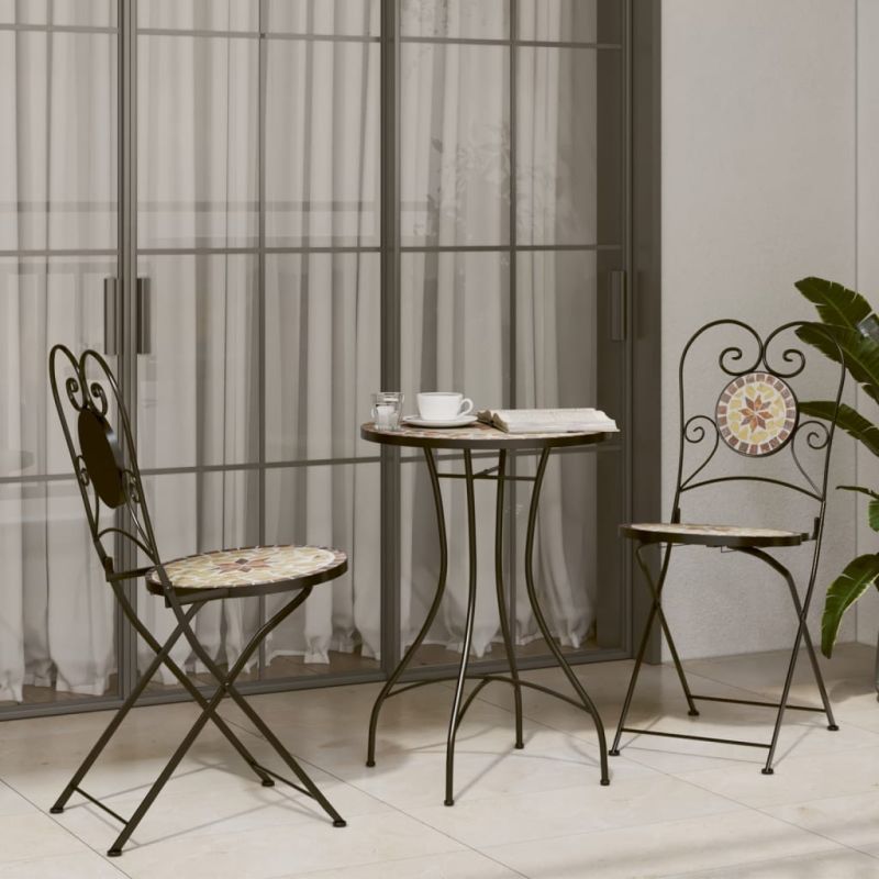 Насладете се на чаша кафе или поговорете със семейството и приятелите си в градината, задния двор или на балкона с този мозаечен комплект за бистро! Стабилен и лесен за почистване плот: Тази градинска маса има керамичен плот, който е здрав, издръжлив и лесен за почистване с влажна кърпа.Здрава и стабилна рамка: Желязната рамка с прахово покритие гарантира, че бистро масата и столовете са здрави и стабилни за ежедневна употреба на закрито или на открито.Сгъваем дизайн: Трапезният стол за бистро може също да се сгъва, за да спести място, когато не се използва.Мозаечен дизайн: Балконският комплект помага за създаването на средиземноморска атмосфера във вашите вътрешни или външни настройки със своя мозаечен дизайн. Добре е да се знае:За да сте сигурни, че вашите външни мебели ще останат красиви, ви препоръчваме да ги защитите с водоустойчиво покривало. Максимално 110 кг на седалка.