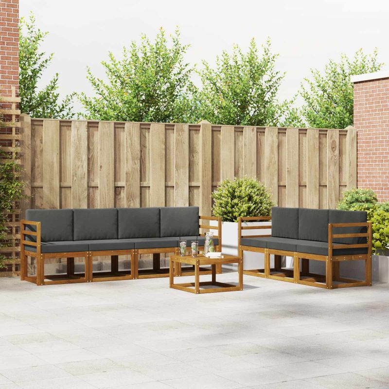 Този комплект за външни мебели обединява стил и практичност, създаваща уникален акцент за градината или терасата. Със своя модерен дизайн, чисти линии и минималистичен вид, той добавя елегантност и е идеален за социални събития. Направен е от масивна акациева дървесина, която гарантира здравина и дълготрайна привлекателност - перфектен за тези, които търсят стил и комфорт навън. Издръжлива масивна акациева дървесина: Тази мебел е изработена от масивна акациева дървесина, трайна и устойчива, идеална за всякакви външни условия. Конструкцията осигурява надеждност и стил, а топлият природен тон придава уют на всяка градина. Устойчив на климатични условия дизайн: С лакирана повърхност, този комплект предлага защита от слънце и дъжд. Полираният завършек запазва външния вид и функционалността, за дълготрайно удоволствие за вашия двор или тераса. Компоненти и дизайн: Всеки елемент, от подлакътниците до гръбчетата, е създаден с мисъл за стил и удобство. Осигурява допълнителен комфорт, а сбитият дизайн го прави визуално балансиран, подходящ за всякакви поводи на открито. Комфорт и гъвкавост: Модулният дизайн позволява различни конфигурации, подходящи за всяко пространство. Отличен за разпускане или социални събирания, комплектът лесно се адаптира, предоставяйки комфорт и удобство по всяко време. Лесна поддръжка: Поддържайте мебелите с влажна кърпа и избягвайте агресивни чистители. Редовната поддръжка запазва външния им вид и удължава живота на мебелите.