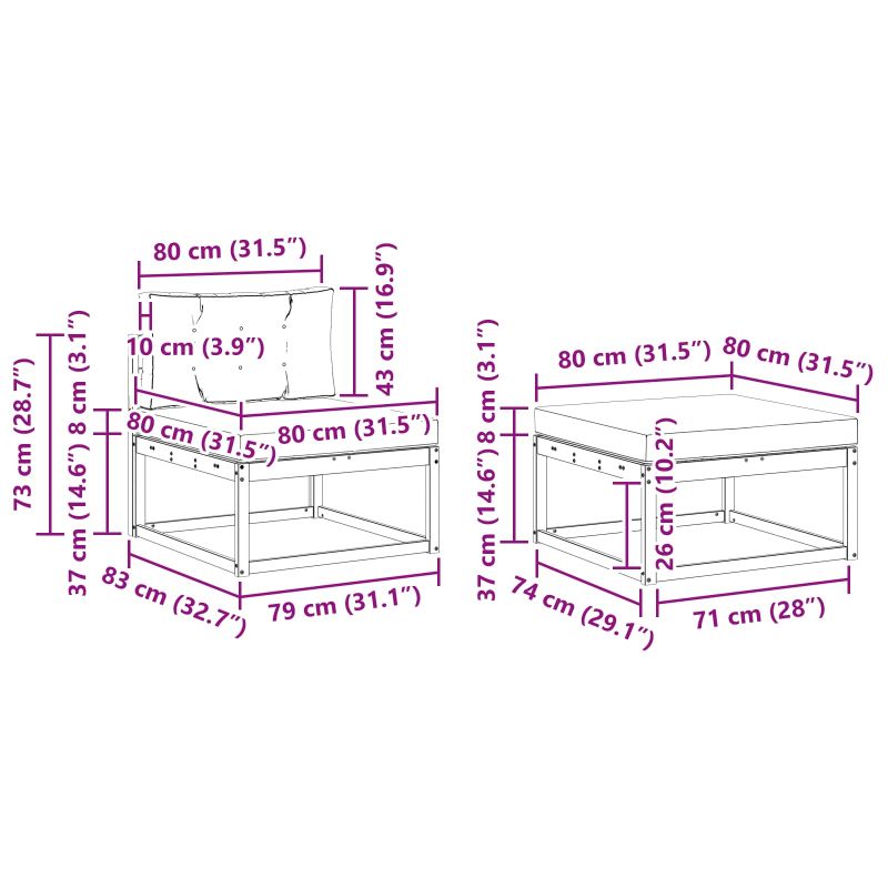 • 3 x Среден диван: 79 x 83 x 73 см (Д x Ш x В)