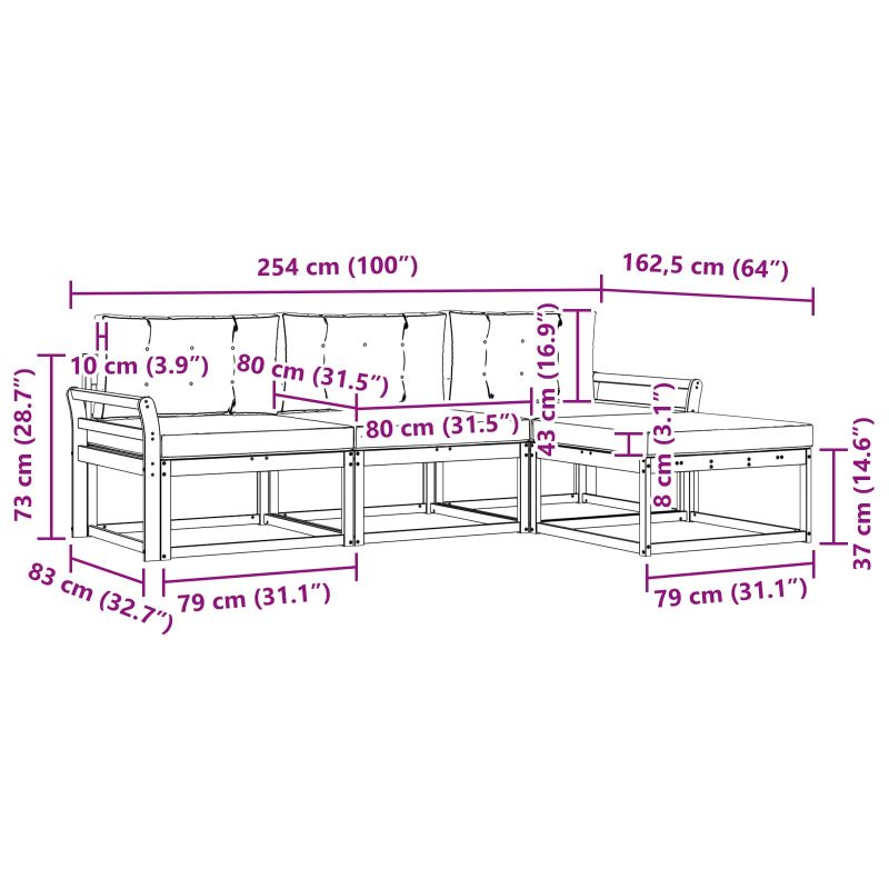 Този комплект за външни дивани съчетава модерен стил и красив дизайн, идеален за преобразуване на всяка градина, патие или зона около басейн в уютна обстановка за релакс и социализиране. Направен е от здраво акациево дърво с наситен кафяв цвят, което не само подобрява визията, но и предлага стабилност срещу различни метеорологични условия. Модуларната конструкция осигурява гъвкавост и креативност при подредбата, независимо от размера на пространство. Конструкция от масивно акациево дърво Този комплект мебели е изработен от независимо устойчиво на времето акациево дърво. Богатият кафяв оттенък добавя стил на всяка градина, а естествената му устойчивост осигурява дълготрайност и красиво излъчване с времето. Модуларен дизайн Предлага гъвкавост в подреждането, така че да можеш да конфигурираш седалките, както ти е удобно. Решетъчната структура осигурява ефективно отводняване при дъжд, което удължава живота на мебелите ти. Устойчиво на времето покритие Проектиран да издържа на външни условия, този комплект запазва яркостта и цялостта си, без значение от времето – от слънчеви дни до дъжд. Ергономичен комфорт Проектиран с удобство на ум: решетъчната облегалка поддържа гърба ти, предоставяйки комфорт при дълги часове на релакс. Лесна поддръжка Поддържай комплекта с покривала, когато не го ползваш, избягвай пряка слънчева светлина и просто избърсвай с влажна кърпа! Така ще му осигуриш дългогодишна красота и удобство.