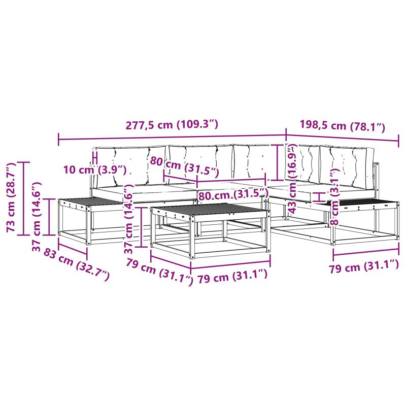 • 5 x Задна възглавница: 60 x 40 x 10 см (Д x Ш x В)
