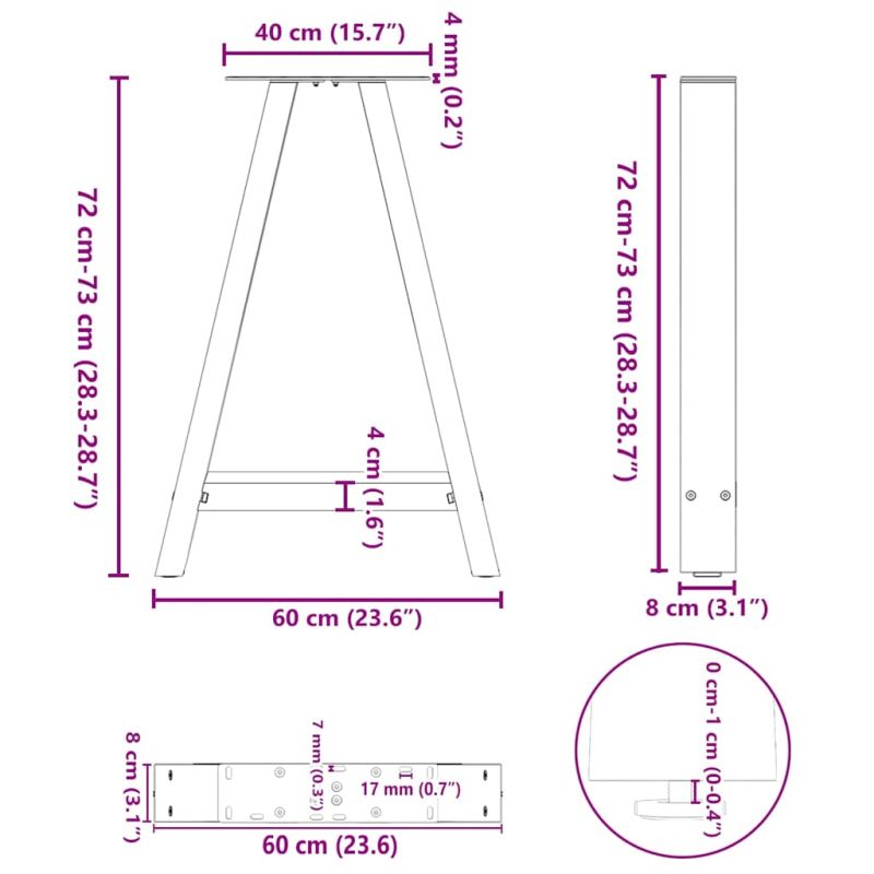 Тези крака за трапезарна маса съчетават форма и функция. Идеален избор за персонализиране на вашата трапезарна маса.Издръжлив материал: Този крак за трапезарна маса е изработен от прахово боядисана стомана, което го прави здрав и дълготраен.Здрава конструкция: А-образният дизайн на крака за трапезарна маса гарантира, че той може да поддържа тежък плот.Практичен дизайн: Този крак за трапезарна маса включва регулируеми нивелири, осигуряващи стабилност дори на неравни подове и минимизиращи драскотините по пода. Освен това, скобата е с предварително пробити отвори и включени в доставката винтове, които могат да се използват за закрепване на крака към плота на масата (не са включени), което улеснява сглобяването.Модерна естетика: Кракът на масата има изчистени линии и геометричен дизайн, за да подобри цялостния вид на мебелите. И се съчетава добре с всеки плот на маса с подходящ размер.Полезно е да знаете:Доставката съдържа само крака за маса, плотът на масата не е включен.