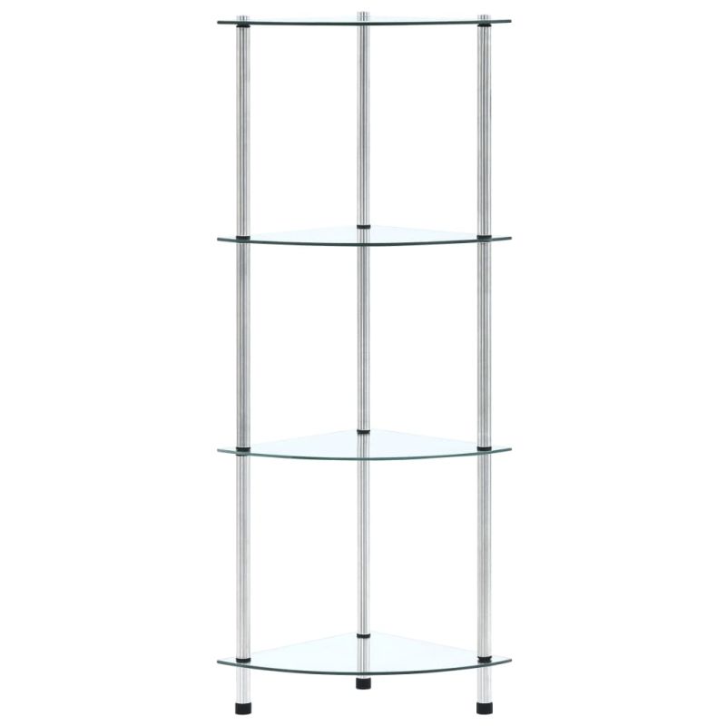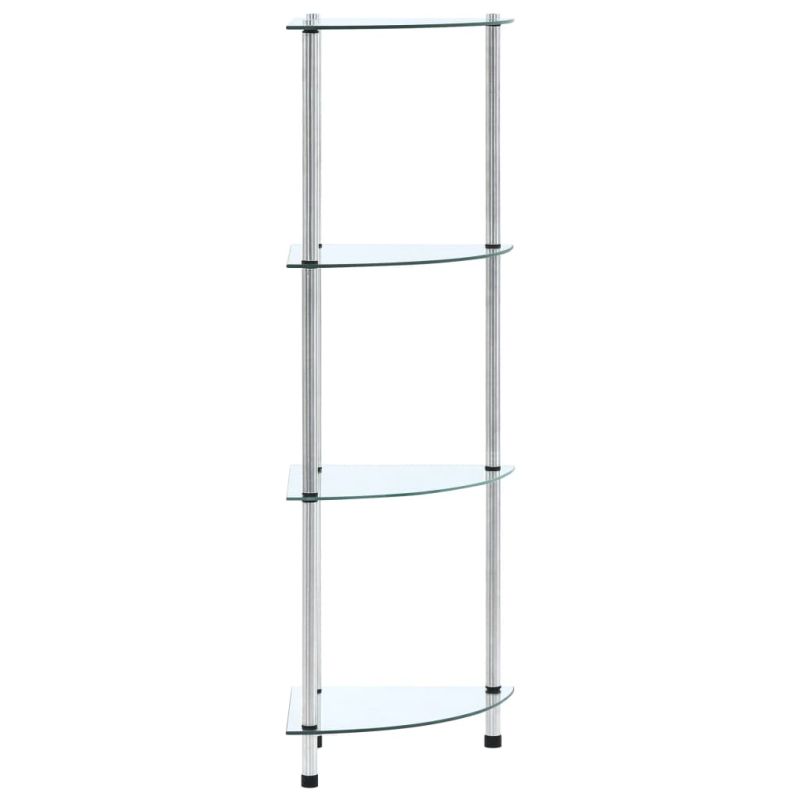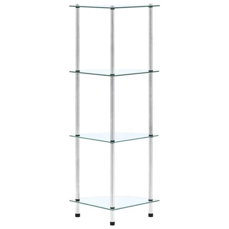 Незабавно добавете нотка на стил към вашето жилищно пространство с нашия съвременен и практичен стъклен рафт! Витрината е проектирана с четири нива за достатъчно място за съхранение. Можете да използвате многофункционалната етажерка във всекидневната или офиса за излагане на колекционерски предмети, фоторамки, саксийни растения или в банята за подреждане на вещи от първа необходимост. Изработен от дебело закалено стъкло и издръжлива неръждаема стомана, този рафт е изключително здрав и безопасен. Освен това гладката повърхност се почиства лесно само с влажна кърпа. Нашият рафт е лесен за сглобяване.
