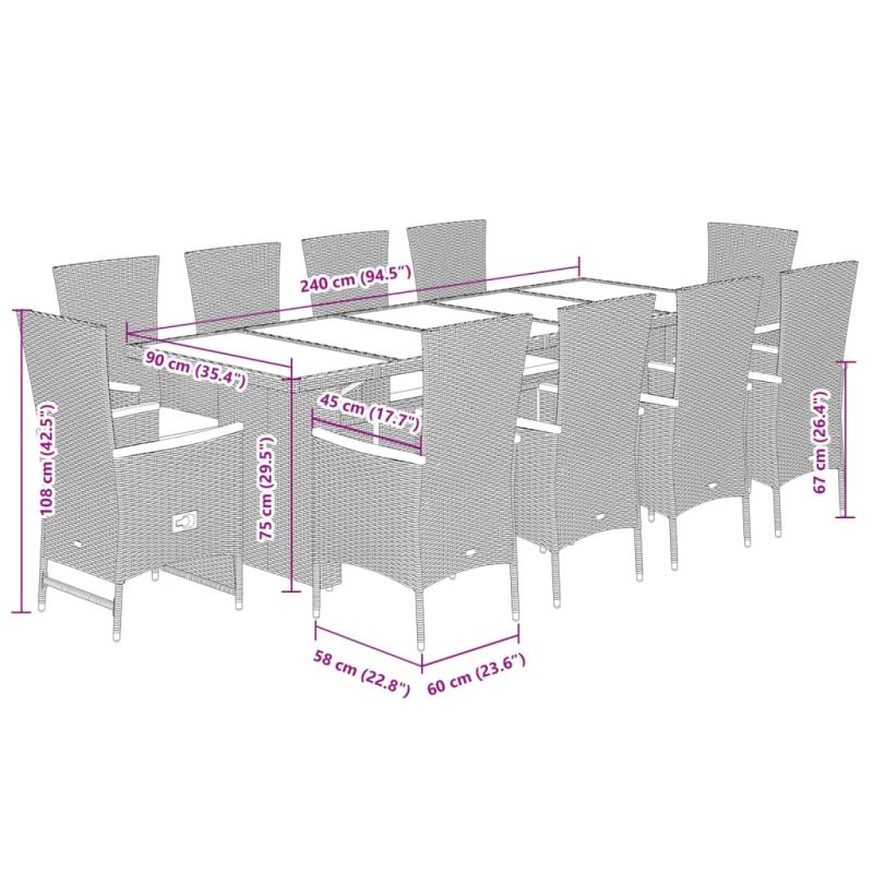 Този градински комплект за хранене е чудесен избор за хранене на открито или просто за релакс в градината, задния двор или на терасата. Издръжлив материал: PE ратанът, известен още като полиратан, е здрав, лесен за поддръжка синтетичен материал, който прилича на естествен ратан. Той е лек, лесен за почистване и често се използва за градински мебели поради своята издръжливост и устойчивост на атмосферни влияния.Регулируема облегалка и поставка за крака: Тази градинска седалка има дръжка. Можете да регулирате облегалката и поставката за крака във всяка позиция, като издърпате дръжката, и бързо да ги върнете в първоначалното им положение.Комфортно седене: Тази градинска мебел, оборудвана с дебело подплатени възглавници, предлага удобно седене.Свалящ се и перещ се калъф: Тези възглавници за седалки имат свалящи се калъфи за лесно пране и поддръжка.Стабилен и лесен за почистване плот: Тази градинска маса има плот от акациево дърво, който е здрав, издръжлив и лесен за почистване с влажна кърпа. Полезно е да знаете:За да сте сигурни, че вашите градински мебели ще останат красиви, препоръчваме да ги защитите с водоустойчив калъф. Максимално 110 кг на седалка. Съобразете се с риска от открит огън и други източници на силна топлина в близост до продукта.