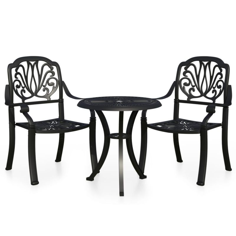 Този бистро комплект, изработен от лят алуминий, осигурява удобно преживяване при седене за вас и вашите гости. Градинските столове и маса, изработени от алуминий, са здрави и издръжливи. Устойчивият на ръжда и на атмосферни влияния материал прави комплекта мебели идеален за използване на открито. Красивите шарки правят бистро комплекта елегантно допълнение към вашето външно пространство. Освен това масичката за кафе има отвор за чадър, който може перфектно да побере чадъра ви, за да ви предпази от слънце или дъжд. Забележка: За да удължите живота на вашите градински мебели, препоръчваме ви да ги почиствате редовно и да не ги оставяте ненужно на открито без защита.Почистване: Използвайте мек сапунен разтворСъхраняване: Ако е възможно, съхранявайте на хладно и сухо място на закрито. Ако продуктът се съхранява на открито, защитете го с водоустойчиво покривало. Избършете и изсушете излишната вода или сняг от плоските повърхности след дъжд или снеговалеж. Позволете достатъчно циркулация на въздуха, за да избегнете повреди, свързани с влагата. Максимално 110 кг на седалка.