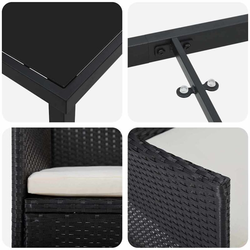 Този стилен комплект за хранене в градината излъчва елегантност и е идеален за събирания на открито в градината или на терасата. Съчетава простота и практичност, с чисти линии и минимален декор. Перфектен е за хранене на открито или за релаксация, а дизайнът му допълва всичко, създавайки приятно място за вашите близки да се насладят на времето навън. Прахово боядисана стоманена рамка: Дизайнът е устойчив на различни метеорологични условия, осигурявайки дълготрайна употреба. Праховото покритие не само увеличава издръжливостта, но и подобрява визията, правейки го идеален за открито през цялата година. Полиратанови облегалка и подлакътници: Комфорт и стил, задължително с ергономична форма. Полиратанът е UV-устойчив, което запазва свежия му вид дори на слънце. Закалена стъклена маса: Има елегантен закален стъклен плот, който е лесен за почистване и устойчив на износване. Перфектно допълва модерен външен вид. Възглавници, устойчиви на времето: Проектирани да понасят различни атмосферни условия, осигурявайки комфорт с невероятно удобен текстил. Пяна за пълнене за приятно усещане. Готов за лятото: Създаден за летни забавления, комплектът е идеален за тераса, палуба или градина. Лесен за сглобяване, с нужда от двама души и отвертка, за да преобразите външното си пространство без усилие. Максимално 110 кг на седалка. Съобразете се с риска от открит огън и други източници на силна топлина в близост до продукта.