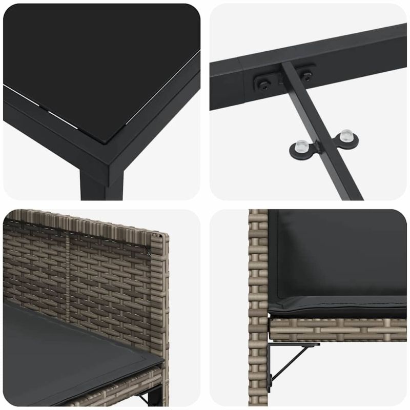 Този модерен комплект за хранене в градината излъчва съвременен шик с елегантните си линии и практичен дизайн, което го прави отличен избор за открити условия. Създаден е за градински тераси и спокойни балкони, а съчетава практичност с стил. Представи си слънчево следобедно чаено парти или вечеря при залез; този комплект е елегантен център, който предлага комфорт и красота на всяко събиране. Материали: Полиратан и стомана са внимателно подбрани за издръжливост, осигурявайки устойчивост на открито. Полиратанът предлага съвременна текстура, която е стилна и устойчива на влага, докато стоманата добавя стабилност и дълговечност, правейки това добро вложение за запазена елегантност. Включени компоненти: Този комплект включва столове с красиви облегалки и възглавници от полиестерно влакно за комфорт. Стилните крака осигуряват стабилност на различни повърхности, допълнени от полиратанни подлакътници. Функции / Дизайн: Стъклената повърхност на масата добавя нотка елегантност и е лесна за почистване, идеална за хранения и напитки. Проектиран с простота и функционалност, той е универсален елемент, който ще обогати всяко открито пространство. Препоръчителни употреби: Перфектен за градина и тераса, този комплект посреща приятели и семейство за хранене на открито или дълги следобеден разговори. Модерният стил лесно се вписва в различни външни среди, допълвайки красотата на твоята тераса. Грижа и поддръжка: За да запазиш безупречния вид, използвай покривало, когато мебелите не се ползват. Тази мярка ще помогне да се защитят мебелите и да се осигури дълготрайна удовлетвореност.