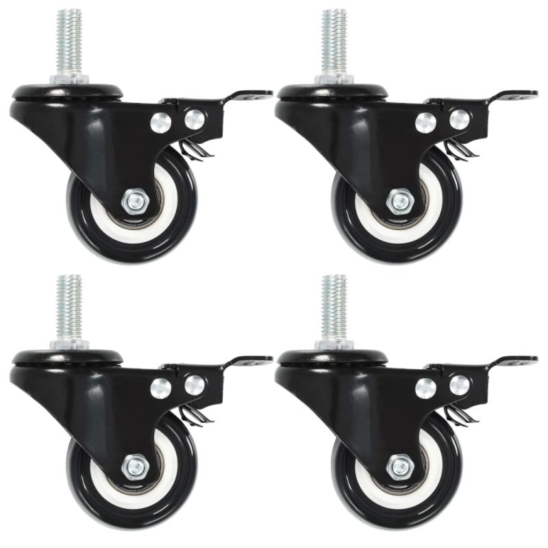 Тези въртящи се колелца със спирачки, всяко с максимална товароносимост от 80 кг, ще бъдат перфектните аксесоари за дребно оборудване и мебели като работна маса, количка, масичка за кафе, стойка за растения, рафт за книги, количка за пазаруване и др. Тези колелца са изработени от PP (полипропилен), който се отличава с добра устойчивост на удар и вибрации, което позволява на колелцата да работят гладко и тихо. Освен това техните меки повърхности ефективно предпазват вашия под от надраскване. Освен това желязната рамка е силно устойчива на ръжда и по този начин допринася за здравината и издръжливостта на колелото. Освен това тези въртящи се колела са оборудвани със спирачки за гъвкаво управление. Всяко колело има максимална товароносимост до 50 кг. Доставката включва 4 въртящи се колела със спирачки.