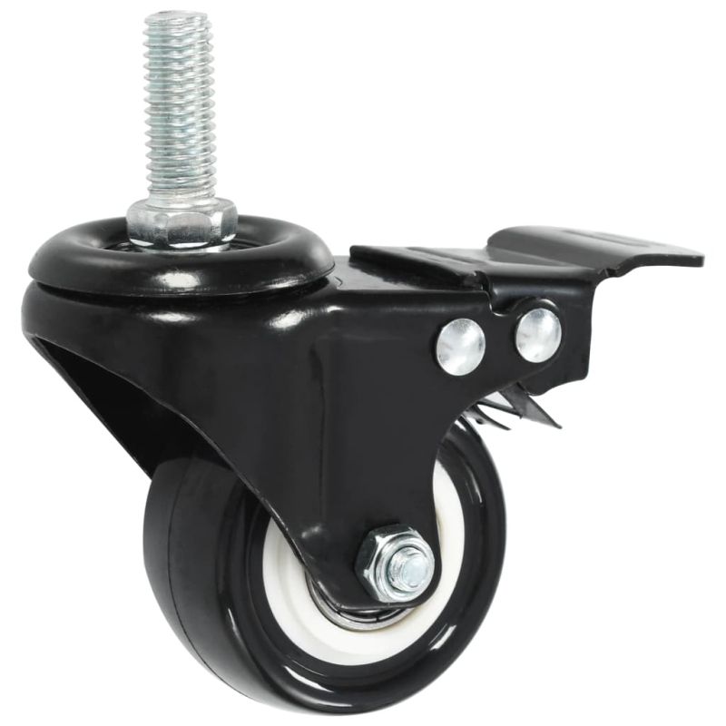 Този комплект от 16 въртящи се колелца със спирачки ще бъде перфектният аксесоар за дребно оборудване и мебели като работна маса, количка, масичка за кафе, стойка за растения, рафт за книги, пазарска количка и др. Тези колелца са изработени от PP (полипропилен), който се отличава с добра устойчивост на удар и вибрации, което позволява на колелцата да работят гладко и тихо. Освен това техните меки повърхности ефективно предпазват вашия под от надраскване. Освен това желязната рамка е силно устойчива на ръжда и по този начин допринася за здравината и издръжливостта на колелото. Освен това тези въртящи се колела са оборудвани със спирачки за гъвкаво управление. Всяко колело има максимална товароносимост до 50 кг. Доставката включва 16 въртящи се колела със спирачки.